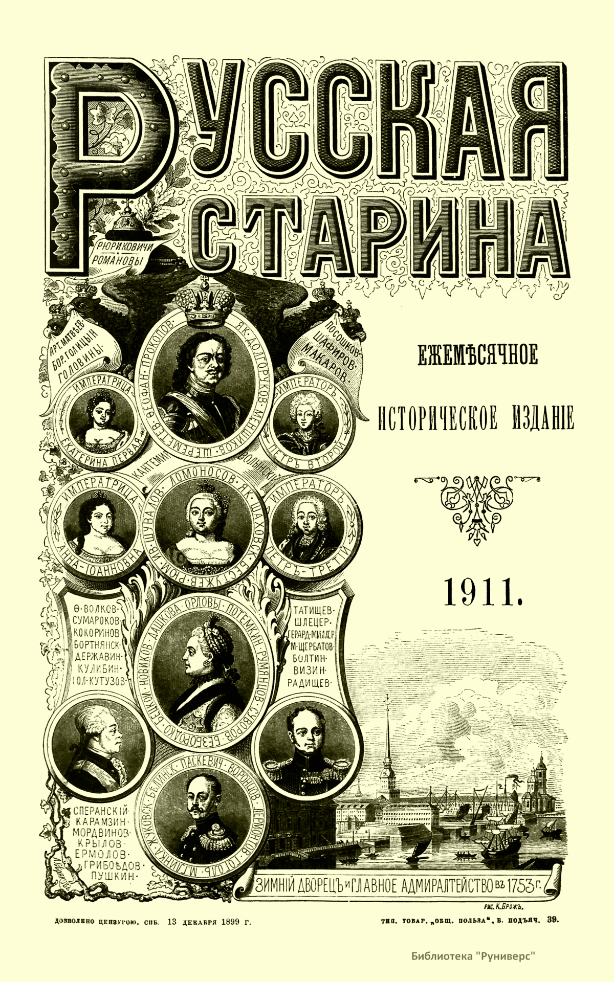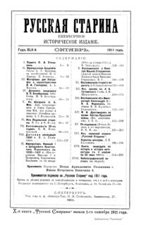 «Русская старина», ежемесячный исторический журнал, выходил в Петербурге в 1870-1918. Основан, издавался и редактировался (1870-1892) М. И. Семевским при участии В. И. Семевского. Последующими редакторами были Н. К. Шильдер (1892-1896), Н. Ф. Дубровин (1896-1904), военные историки С. П. Зыков, П. Н. Воронов.