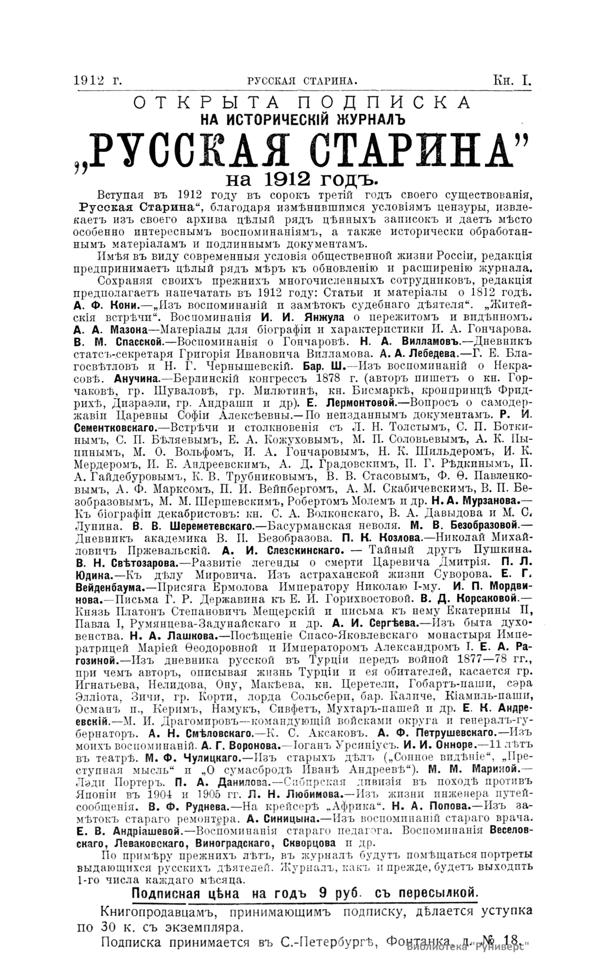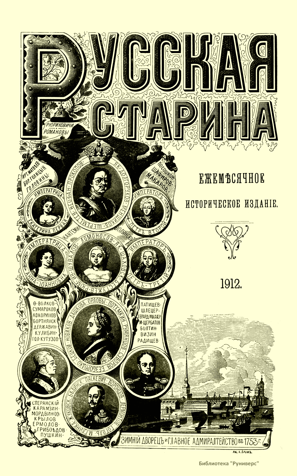 «Русская старина», ежемесячный исторический журнал, выходил в Петербурге в 1870-1918. Основан, издавался и редактировался (1870-1892) М. И. Семевским при участии В. И. Семевского. Последующими редакторами были Н. К. Шильдер (1892-1896), Н. Ф. Дубровин (1896-1904), военные историки С. П. Зыков, П. Н. Воронов.