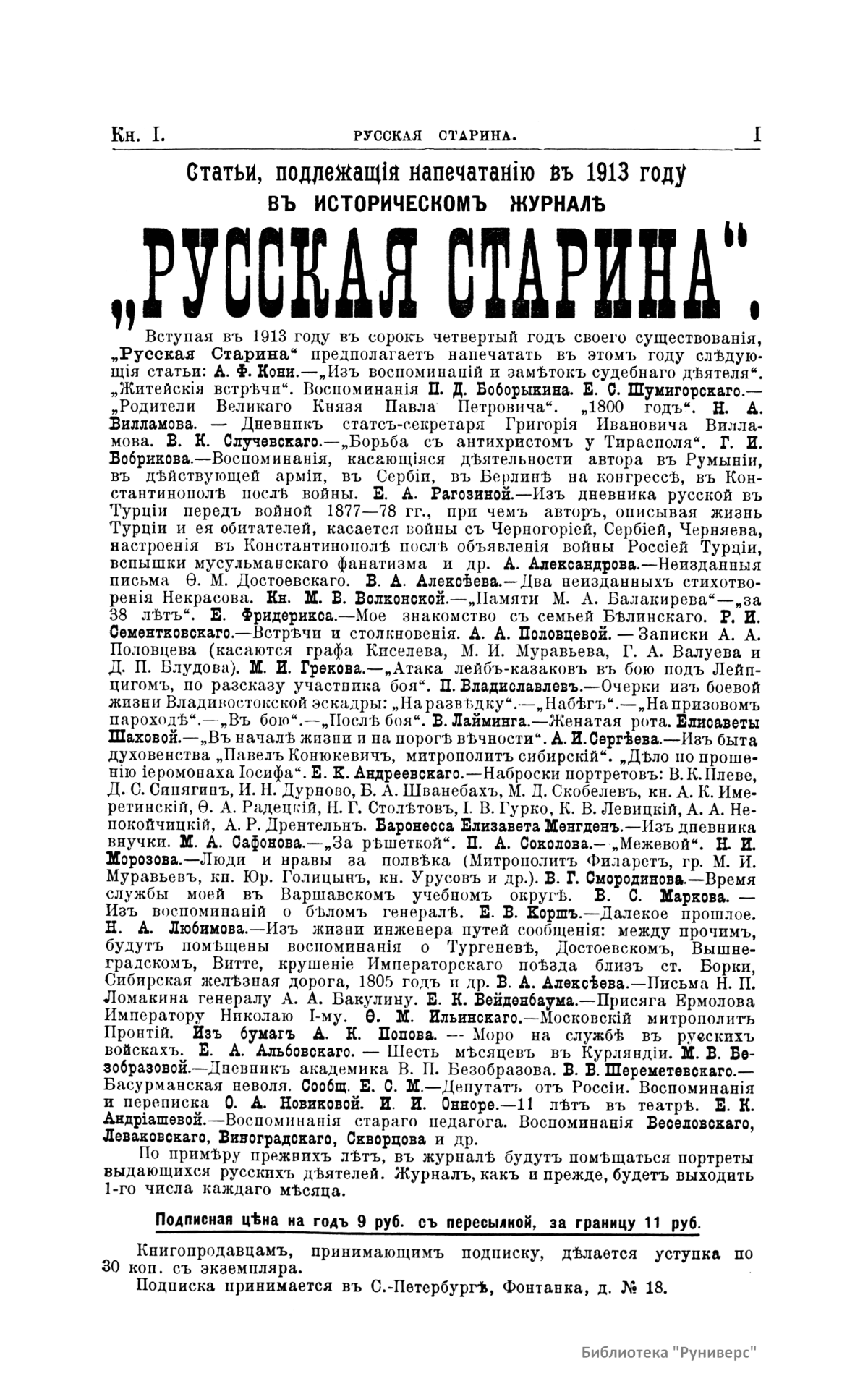 На страницах «Русской старины» напечатаны думы, послания, эпиграммы К. Ф. Рылеева, басни И. А. Крылова, И. И. Хемницера, Измайлова, стихотворения графа А. К. Толстого, К. Р., Я. Б. Княжнина, А. Н. Нахимова, К. П. Батюшкова, барона Дельвига, Розенгейма, В. А. Жуковского, М. Ю. Лермонтова, А. И. Одоевского, Кюхельбекера, Баратынского, вновь найденные строфы из «Евгения Онегина» и отрывки из «Мертвых душ», а также автобиографии и переписки писателей, под редакцией П. А. Ефремова. Статьи и исследования по вопросам новейшей русской истории принадлежат самому М. И. Семевскому, В. А. Бильбасову, А. П. Брикнеру, князю Н. С. Голицыну, Д. И. Иловайскому, П. И. Карцову, барону Н. А. Корфу, Н. И. Костомарову, И. И. Ореусу, А. Н. Петрову, В. И. Семевскому, Н. К. Шильдеру и др.К журналу выпущены отдельные издания: Указатель «Русская старина».СПб, 1883 г . (1 том), «Систематическая роспись содержания «Русской старины» за 1870-1884 гг.» (СПб., 1885), и четыре прибавления: за 1885-1887 гг. (СПб., 1888), за 1888-1890 гг. (СПб., 1891), за 1891-1896 гг. (СПб., 1897), за 1896-1902 гг. (СПб., 1903) (5 изданий в 3-х томах), сборник гравюр «Русские деятели в портретах изданных редакциею исторического журнала «Русская старина». СПб, 1886-1891 гг.(5 изданий, 2 тома).