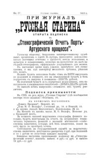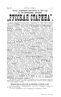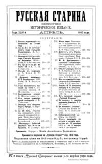 «Русская старина», ежемесячный исторический журнал, выходил в Петербурге в 1870-1918. Основан, издавался и редактировался (1870-1892) М. И. Семевским при участии В. И. Семевского. Последующими редакторами были Н. К. Шильдер (1892-1896), Н. Ф. Дубровин (1896-1904), военные историки С. П. Зыков, П. Н. Воронов.