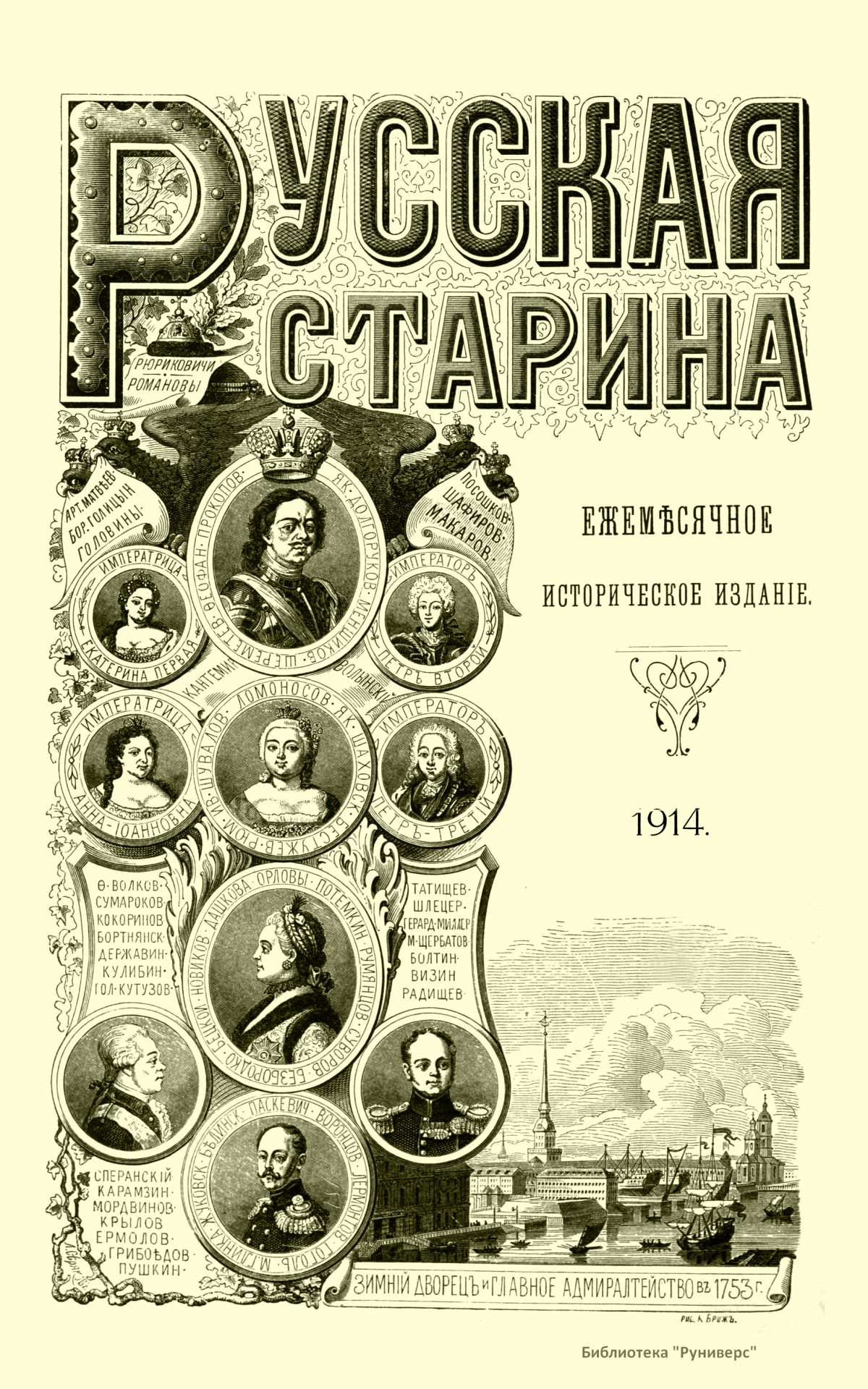 «Русская старина», ежемесячный исторический журнал, выходил в Петербурге в 1870-1918. Основан, издавался и редактировался (1870-1892) М. И. Семевским при участии В. И. Семевского. Последующими редакторами были Н. К. Шильдер (1892-1896), Н. Ф. Дубровин (1896-1904), военные историки С. П. Зыков, П. Н. Воронов.