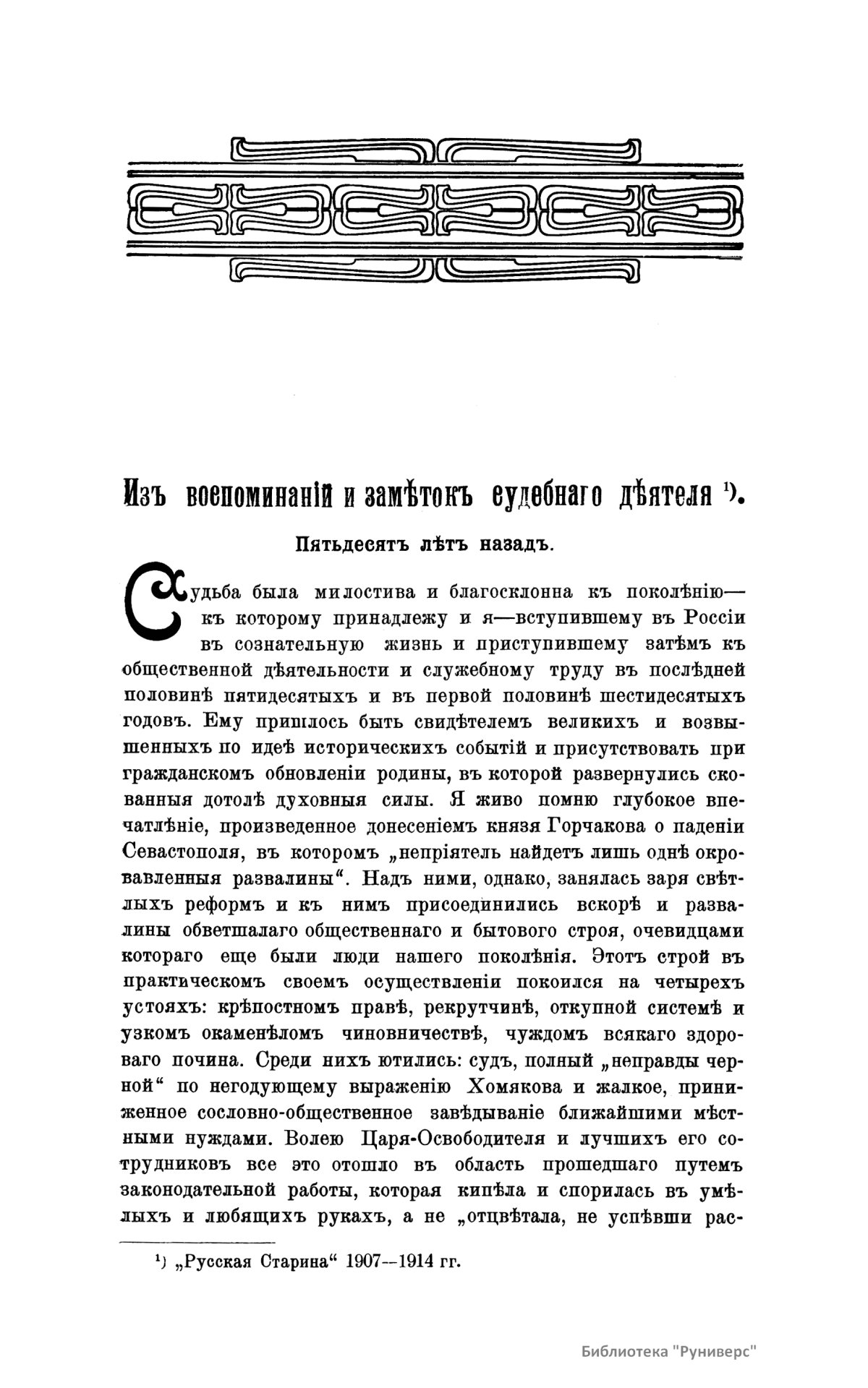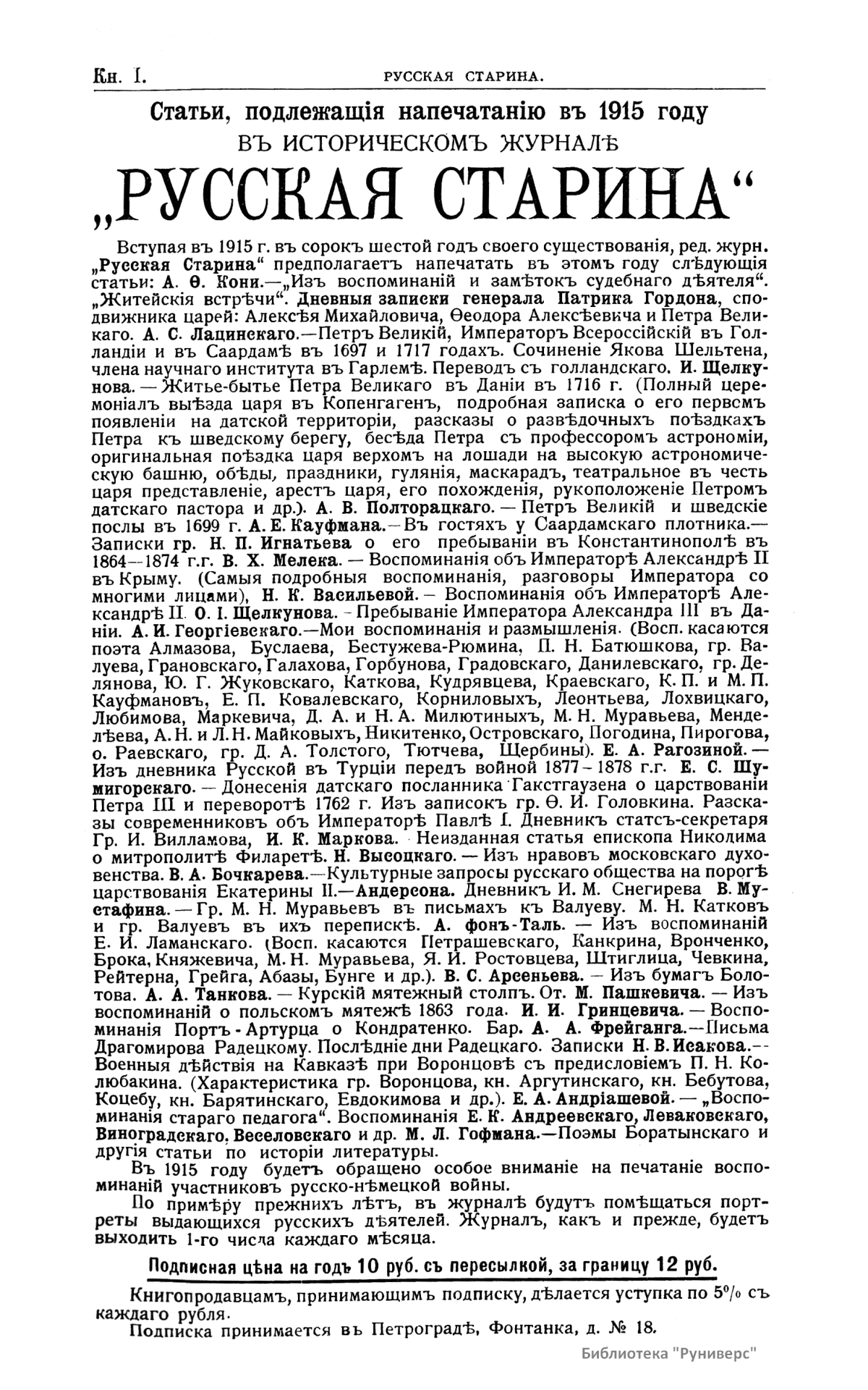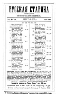 «Русская старина», ежемесячный исторический журнал, выходил в Петербурге в 1870-1918. Основан, издавался и редактировался (1870-1892) М. И. Семевским при участии В. И. Семевского. Последующими редакторами были Н. К. Шильдер (1892-1896), Н. Ф. Дубровин (1896-1904), военные историки С. П. Зыков, П. Н. Воронов.