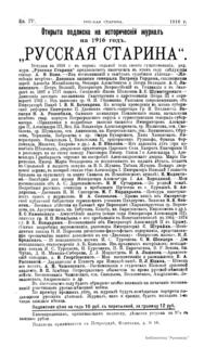 «Русская старина», ежемесячный исторический журнал, выходил в Петербурге в 1870-1918. Основан, издавался и редактировался (1870-1892) М. И. Семевским при участии В. И. Семевского. Последующими редакторами были Н. К. Шильдер (1892-1896), Н. Ф. Дубровин (1896-1904), военные историки С. П. Зыков, П. Н. Воронов.