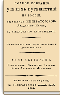 Полное собрание ученых путешествий по России, издаваемое Императорскою Академией Наук, по предложению ее президента. Том четвертый. Продолжение Записок Путешествия Академика Лепехина