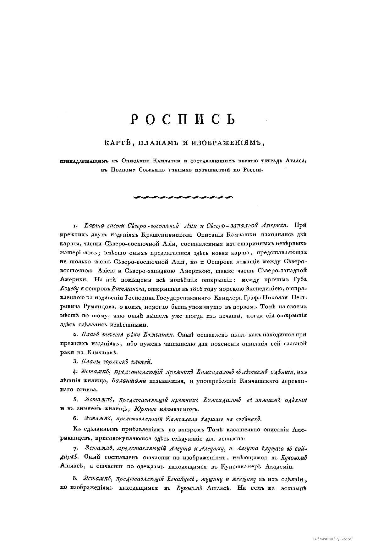 Атлас содержит иллюстративный материал к «Полному собранию ученых путешествий по России», издававшемуся под эгидой Санкт-Петербургской академии наук в 1818–1825 гг. В первую тетрадь первой части атласа вошли карты, планы и иллюстрации, относящиеся к исследованию С. П. Крашенинникова «Описание земли Камчатки» (1 и 2 тома «Собрания»). Вторая тетрадь первой части включает изображения к «Запискам путешествия академика И. И. Лепехина» (3, 4 и 5 тома). Вторая часть атласа с рисунками к «Запискам путешествия академика Фалька», как и восьмой том «Собрания», который должен был содержать третью часть исследования Фалька, изданы не были.