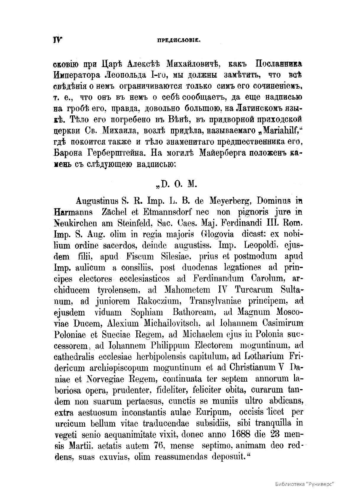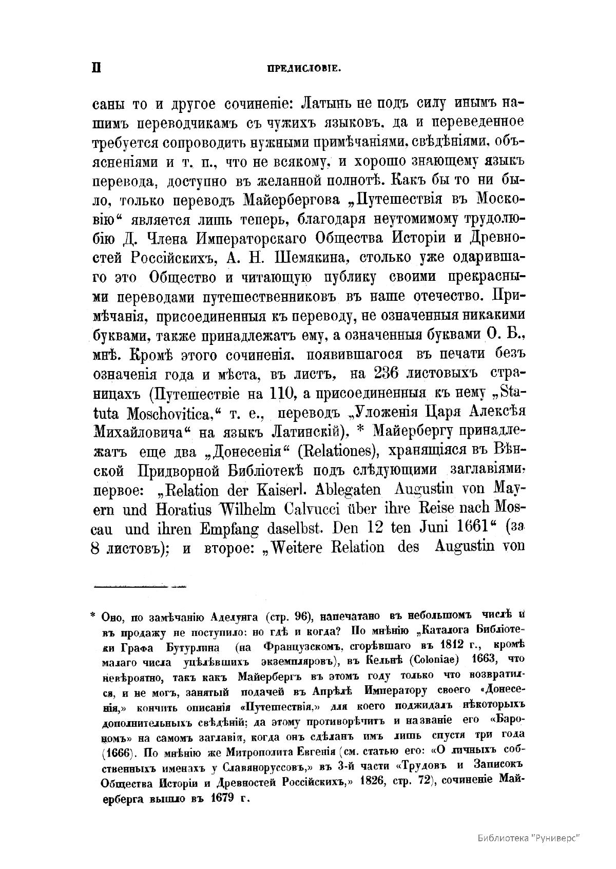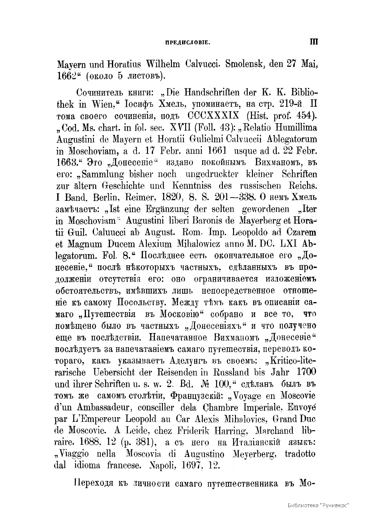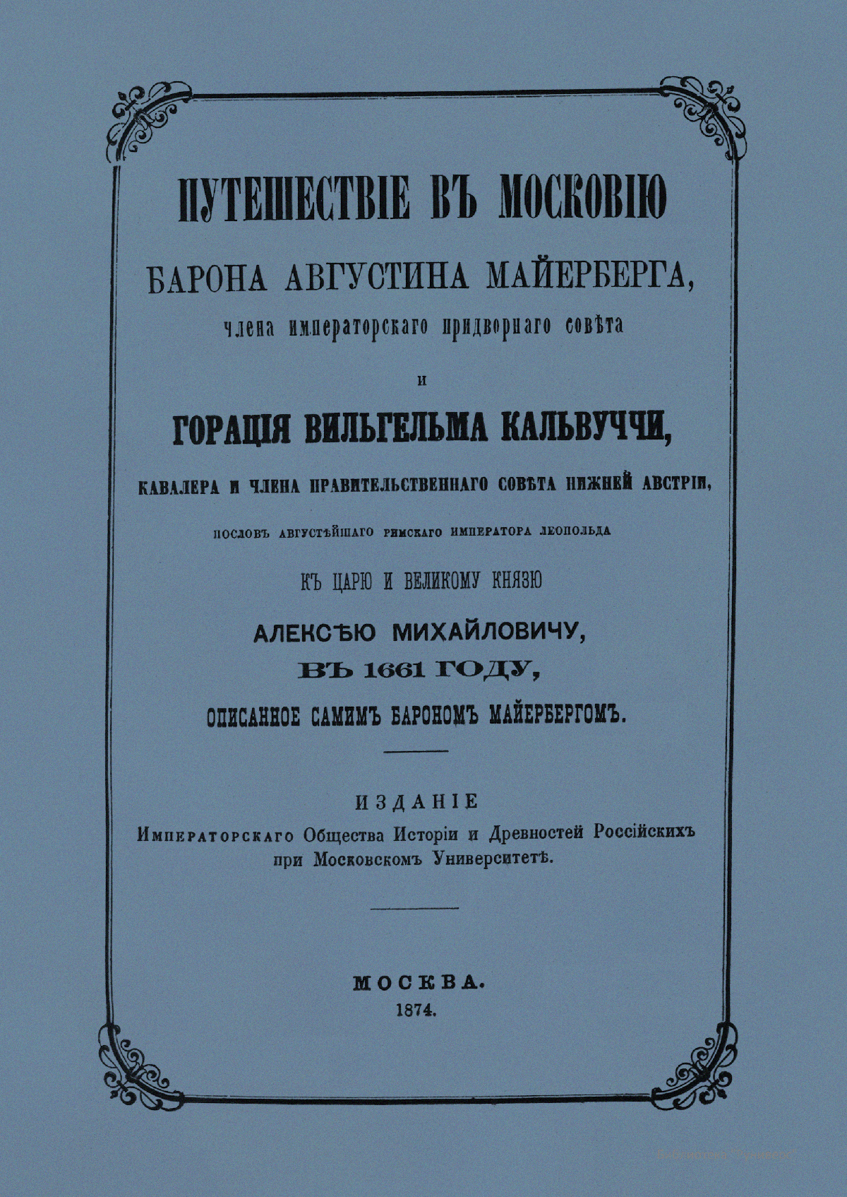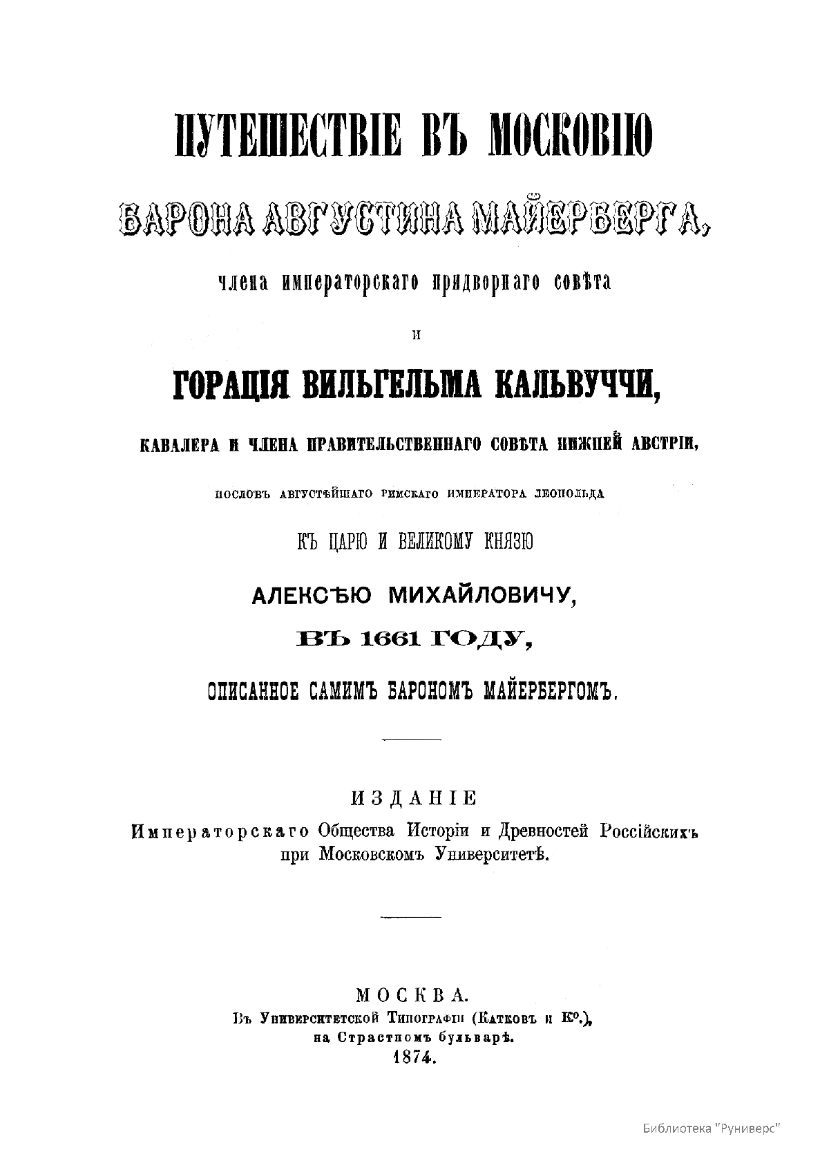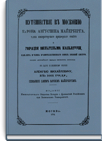 Путешествiе въ Московiю барона Августина Майерберга и Горацiя Вильгельма Кальвуччи, пословъ Августѣйшега Римскаго Императора Леопольда къ Царю и Великому Князю Алексѣю Михайловичу въ 1661 году, описанное самимъ барономъ Майербергомъ