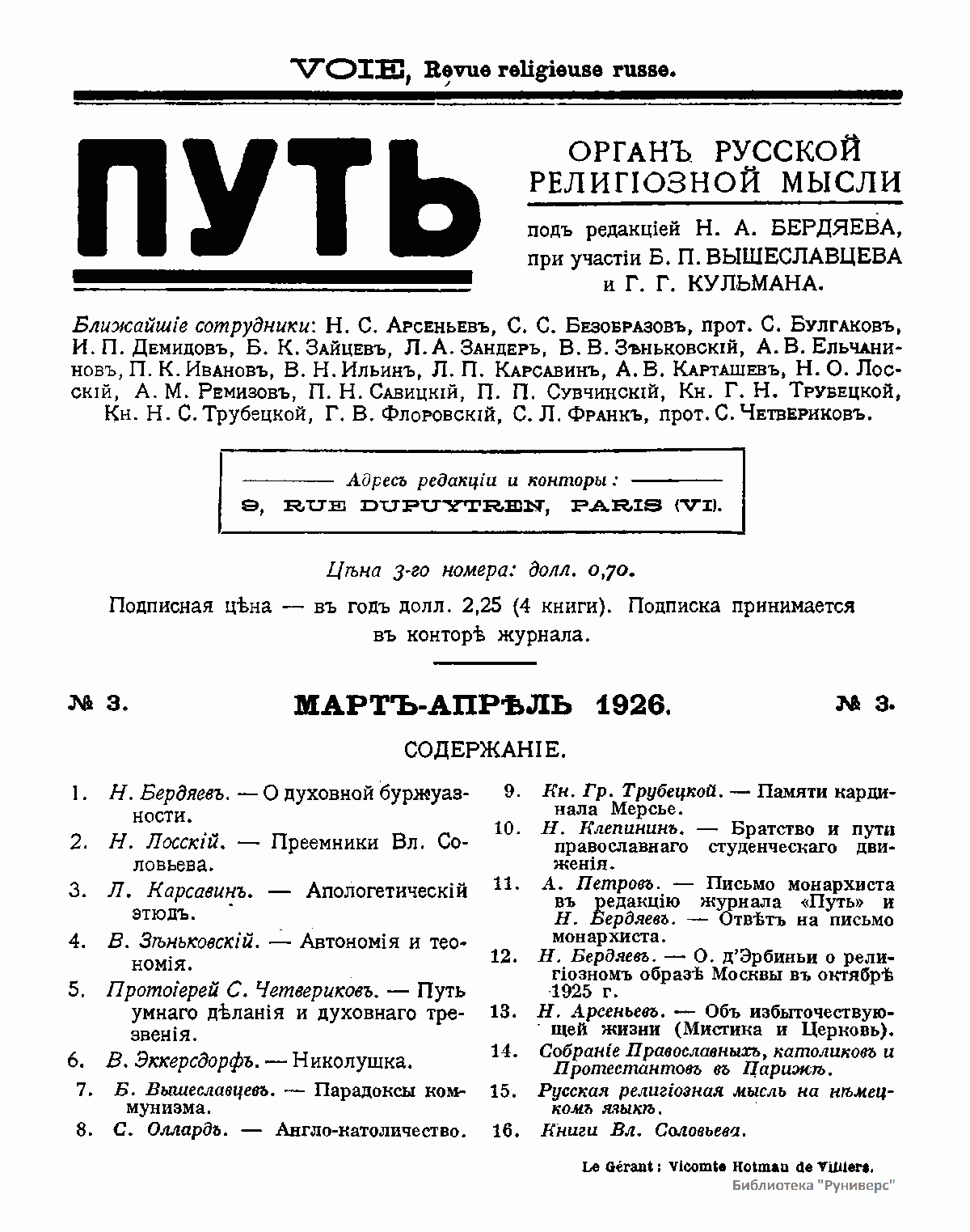 (1877- 1950) и др. В дальнейшем состав сотрудников менялся, привлекались также немецкие и английские корреспонденты (Ж. Маритен, П. Тиллих, С. Оллард и др.). Всего с журналом за 15 лет его существования сотрудничали около 130 человек. Журнал насчитывал 61 выпуск при тираже 1000–1200 экземпляров. По своему формату это было интеллектуальное богословско-философское периодическое издание, включающее наряду с академическими статьями, публицистику, эссе, письма, мемуары.