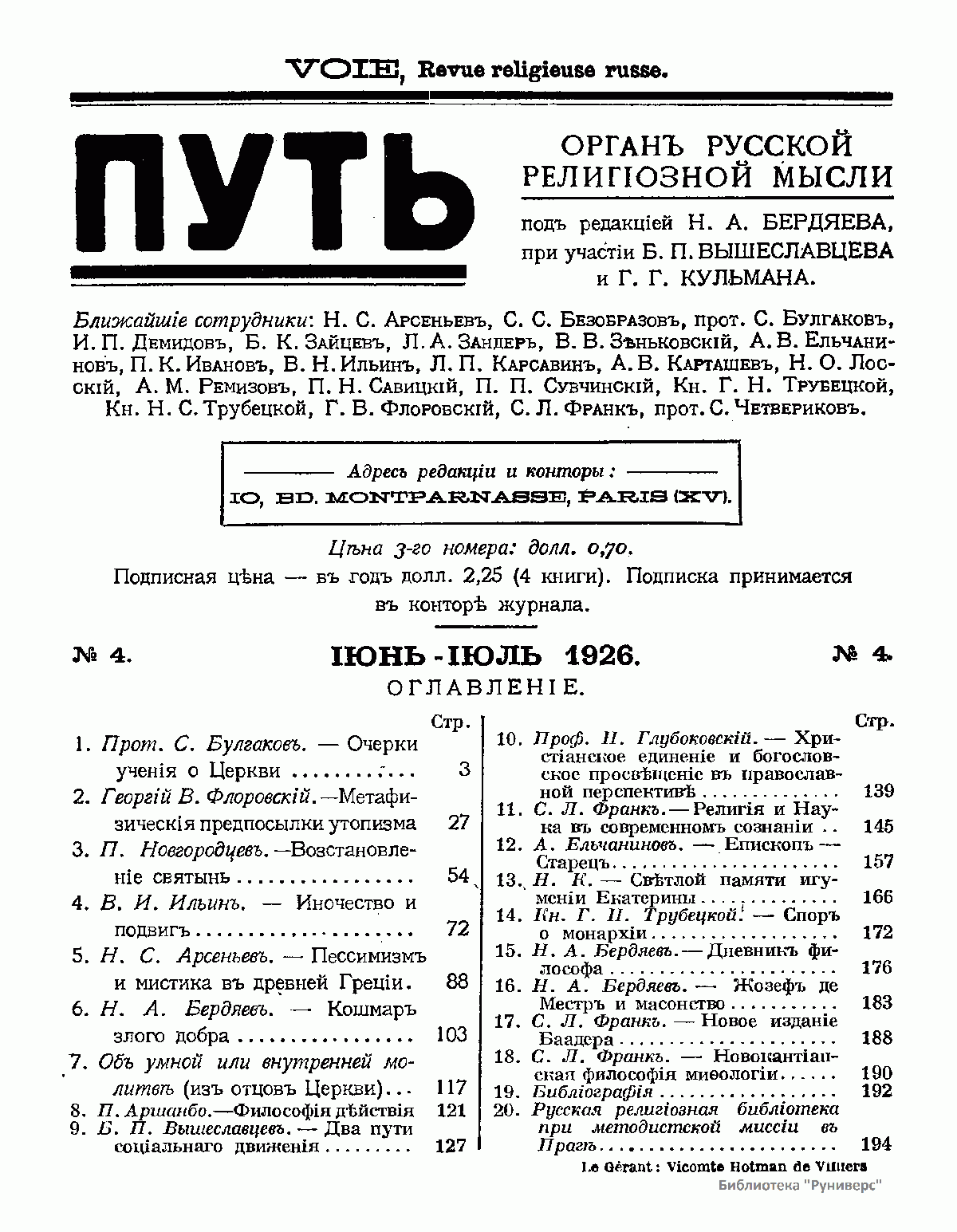Путь: Орган русской религиозной мысли. №4. Июнь-Июль 1926
