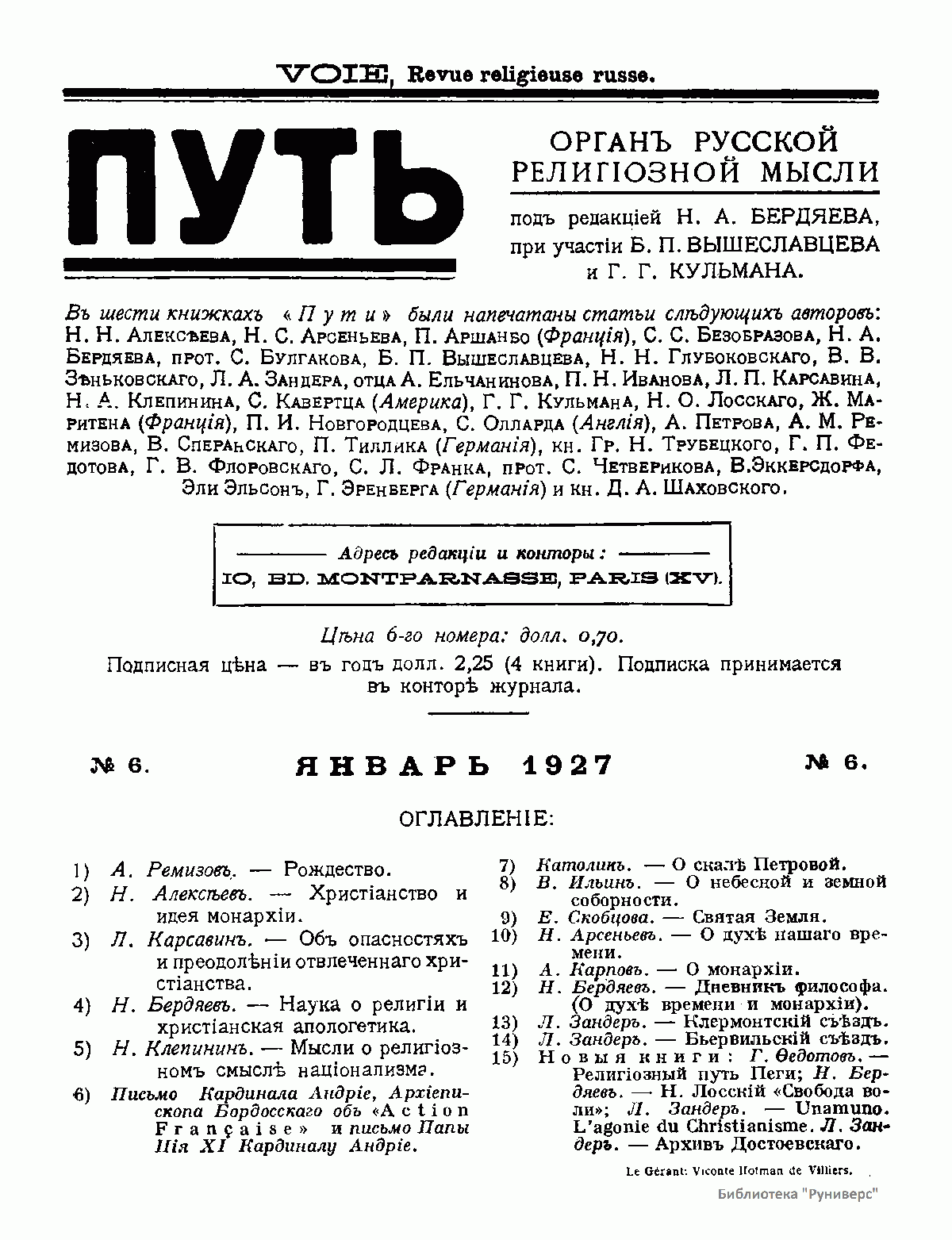 Путь: Орган русской религиозной мысли. №6. Январь 1927