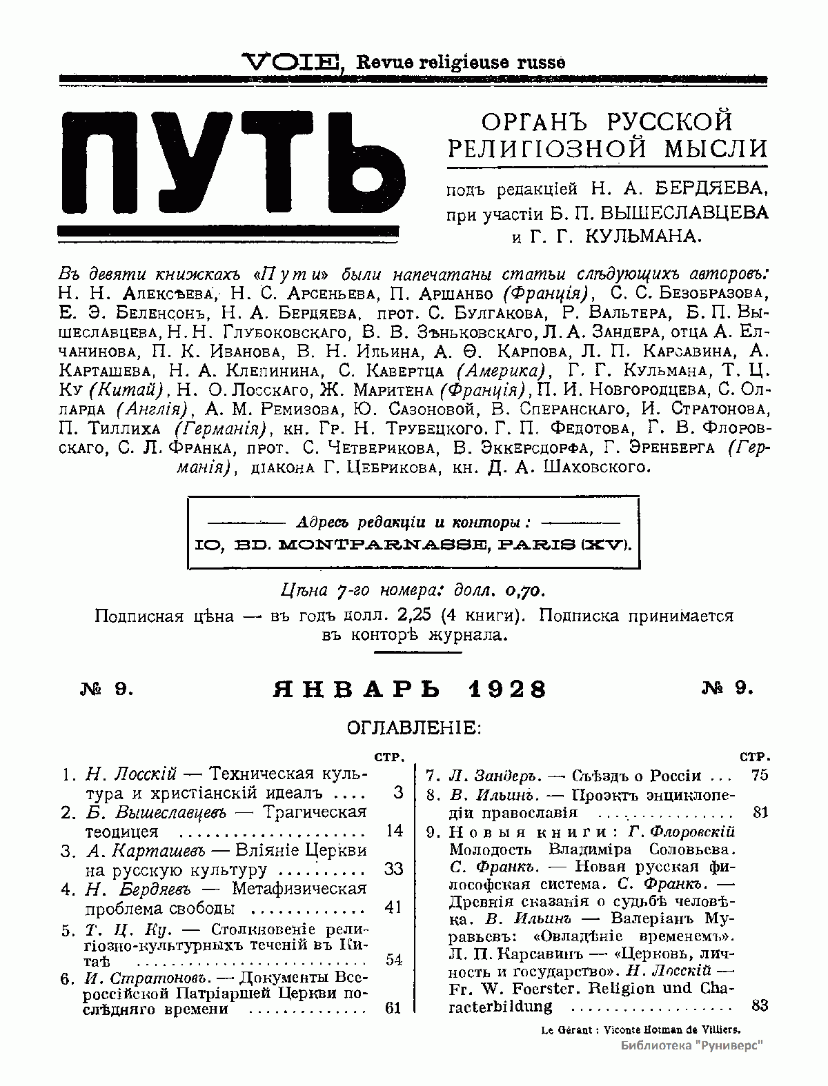 Путь: Орган русской религиозной мысли. №9. Январь 1928