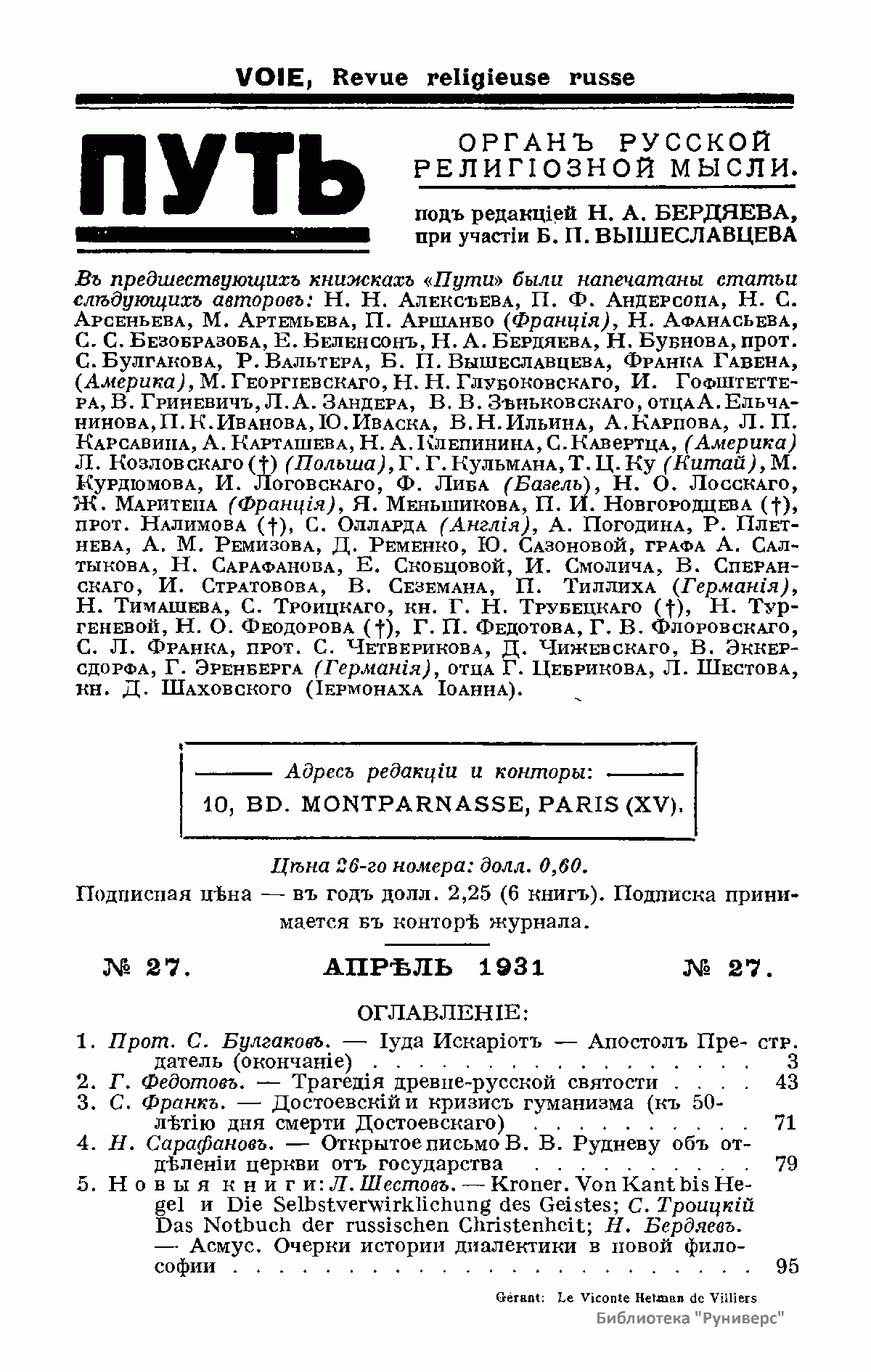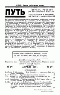 Путь: Орган русской религиозной мысли. №27. Апрель 1931