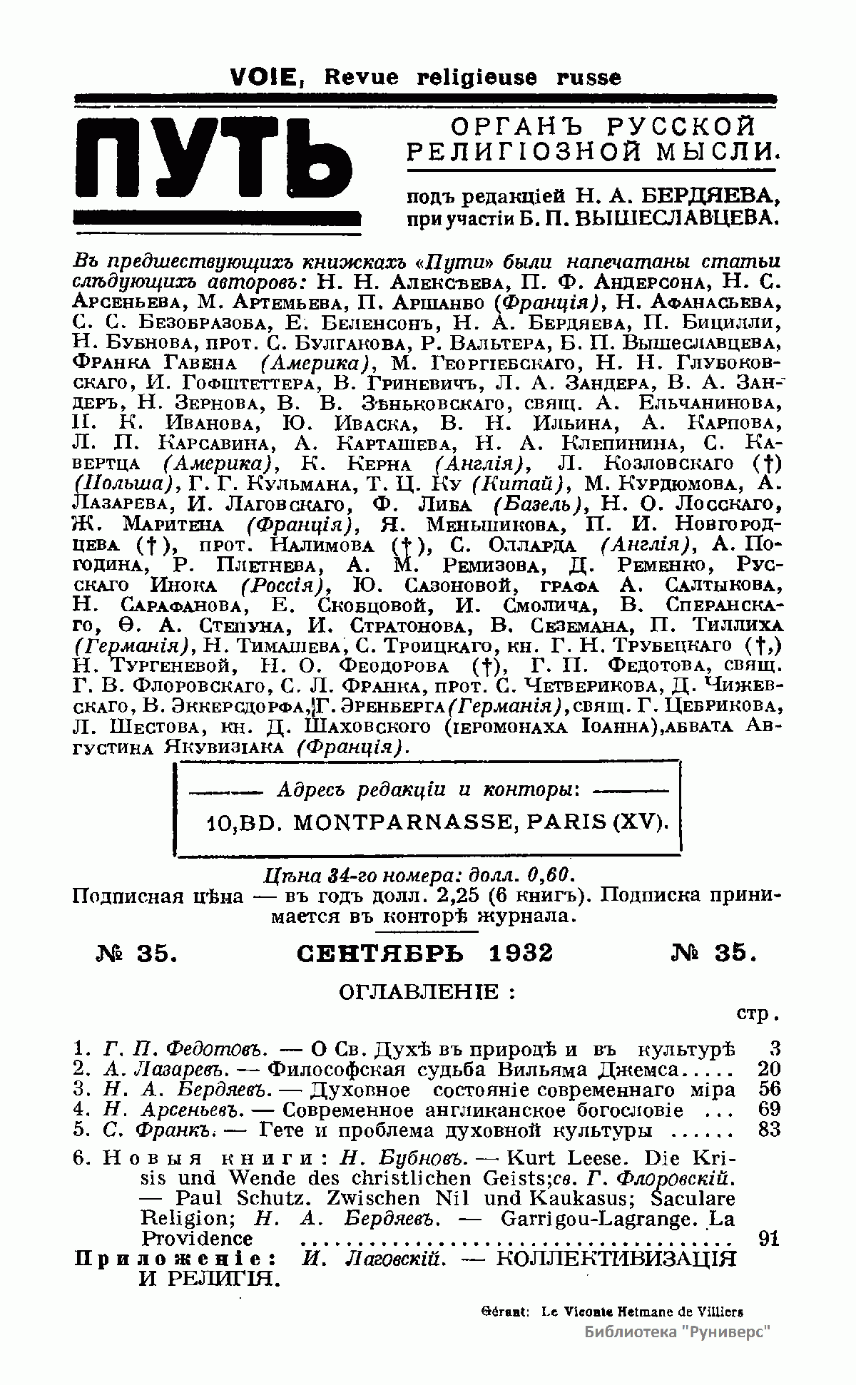 Путь: Орган русской религиозной мысли. №35. Сентябрь 1932