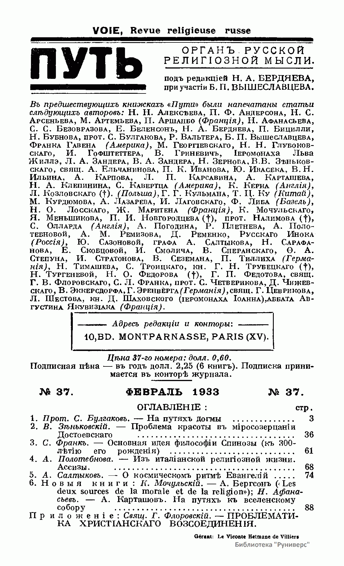 Путь: Орган русской религиозной мысли. №37. Февраль 1933