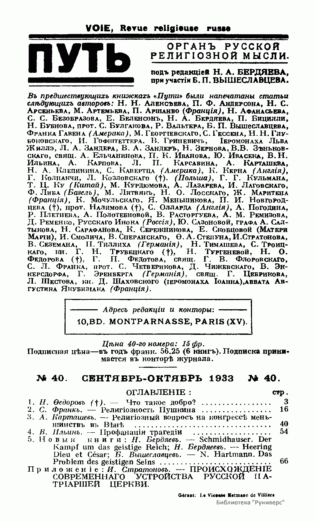 Путь: Орган русской религиозной мысли. №40. Сентябрь-Октябрь 1933