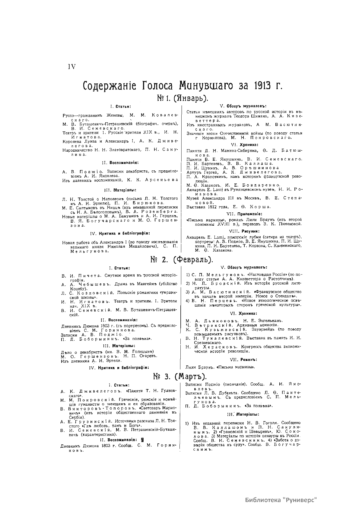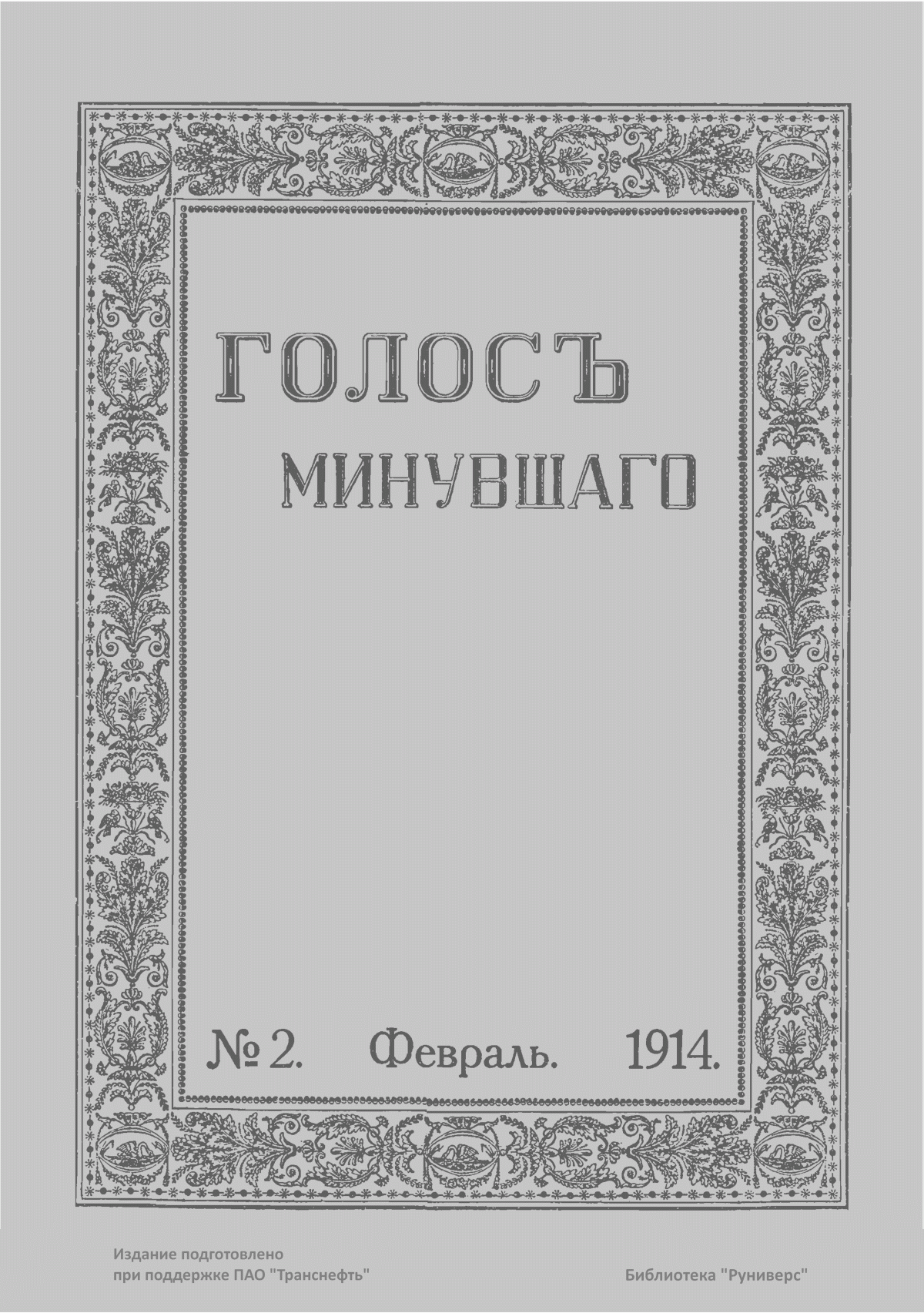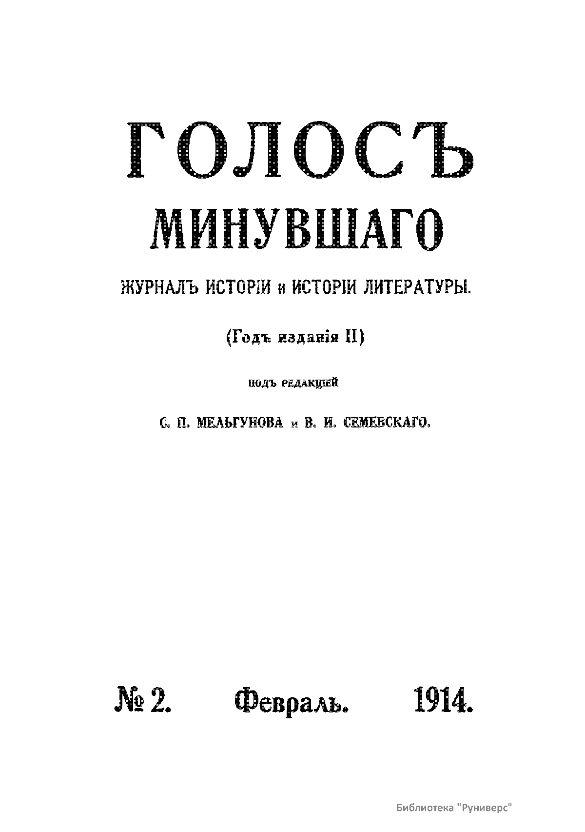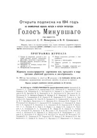 «Голос Минувшего» — журнал истории и истории литературы либерально-народнического направления, издававшийся в Москве с 1913 по 1923 год. Издателем журнала в 1913–1922 годах были известные русские историки, публицисты и общественные деятели С. П. Мельгунов (1880–1956) и В. И. Семевский (1848–1916). В редакционную коллегию также входили А. К. Дживелегов и П. Н. Сакулин. До 1919 «Голос минувшего» выходил ежемесячно, затем нерегулярно, всего было выпущено 65 номеров. В журнале публиковались интереснейшие материалы, посвященные истории литературы и общественных движений в России второй половины XVIII – начала XX веков. Здесь можно найти: статьи по вопросам русской и всеобщей истории, истории литературы, философии, искусства и археологии. В издании представлены: историческая беллетристика, биографии русских и иностранных деятелей, критика и библиография, новости русской и иностранной науки, обзор журналов русских и иностранных, хроника, мемуары, записки, дневники и письма декабристов, видных народовольцев и эсеров, крупных общественных деятелей и царских администраторов, писателей, военачальников и др. Среди авторов: Е. В. Тарле, А. Ф. Кони, А. К. Дживелегов, А. А. Кизеветтер, В. Г. Короленко и др. Стремление сделать журнал интересным для более широкого круга читателей способствовало тому, что в «Голосе Минувшего», хоть и в ограниченном количестве, печатались статьи по истории искусства и помещались иллюстрации: портреты, картины и рисунки, не знакомые или мало знакомые публике. В журнале опубликован целый ряд интересных писем, документов и воспоминаний. Абсолютное большинство текстов никогда не переиздавалось. Журнал снабжен указателями имен за 1913–1922 годы и систематическим указателем содержания.