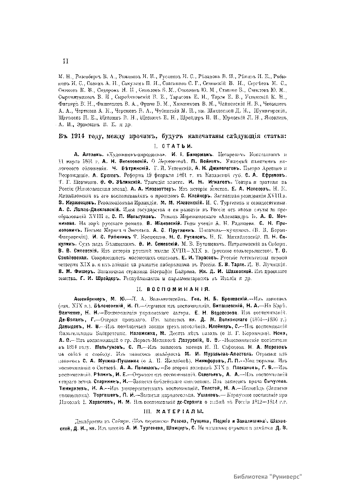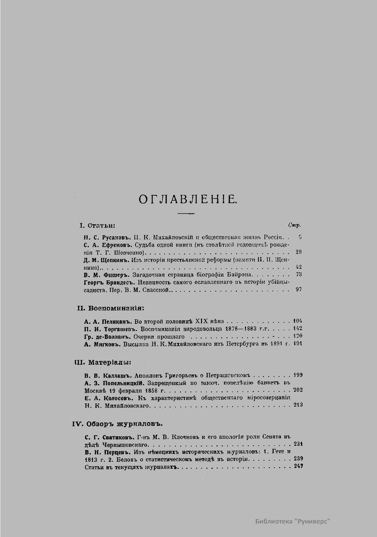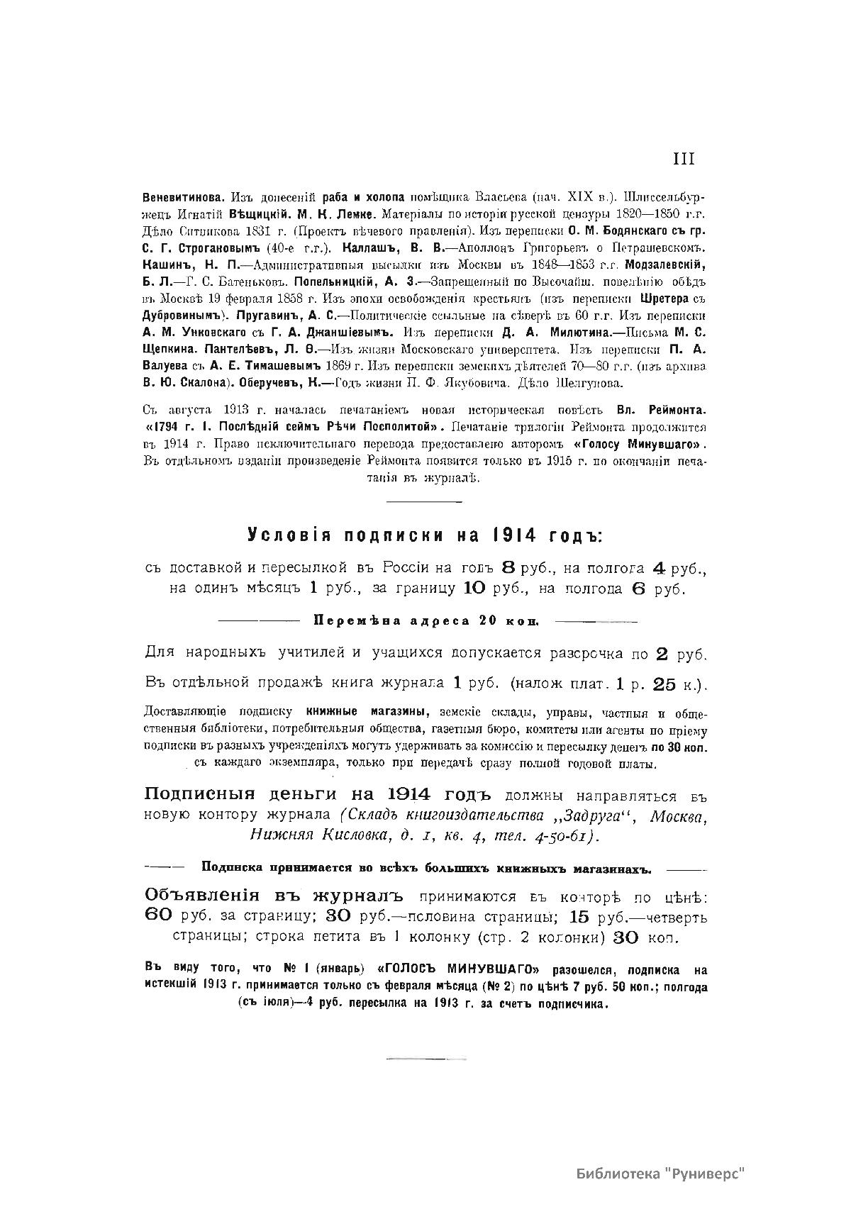 «Голос Минувшего» — журнал истории и истории литературы либерально-народнического направления, издававшийся в Москве с 1913 по 1923 год. Издателем журнала в 1913–1922 годах были известные русские историки, публицисты и общественные деятели С. П. Мельгунов (1880–1956) и В. И. Семевский (1848–1916). В редакционную коллегию также входили А. К. Дживелегов и П. Н. Сакулин. До 1919 «Голос минувшего» выходил ежемесячно, затем нерегулярно, всего было выпущено 65 номеров. В журнале публиковались интереснейшие материалы, посвященные истории литературы и общественных движений в России второй половины XVIII – начала XX веков. Здесь можно найти: статьи по вопросам русской и всеобщей истории, истории литературы, философии, искусства и археологии. В издании представлены: историческая беллетристика, биографии русских и иностранных деятелей, критика и библиография, новости русской и иностранной науки, обзор журналов русских и иностранных, хроника, мемуары, записки, дневники и письма декабристов, видных народовольцев и эсеров, крупных общественных деятелей и царских администраторов, писателей, военачальников и др. Среди авторов: Е. В. Тарле, А. Ф. Кони, А. К. Дживелегов, А. А. Кизеветтер, В. Г. Короленко и др. Стремление сделать журнал интересным для более широкого круга читателей способствовало тому, что в «Голосе Минувшего», хоть и в ограниченном количестве, печатались статьи по истории искусства и помещались иллюстрации: портреты, картины и рисунки, не знакомые или мало знакомые публике. В журнале опубликован целый ряд интересных писем, документов и воспоминаний. Абсолютное большинство текстов никогда не переиздавалось. Журнал снабжен указателями имен за 1913–1922 годы и систематическим указателем содержания.