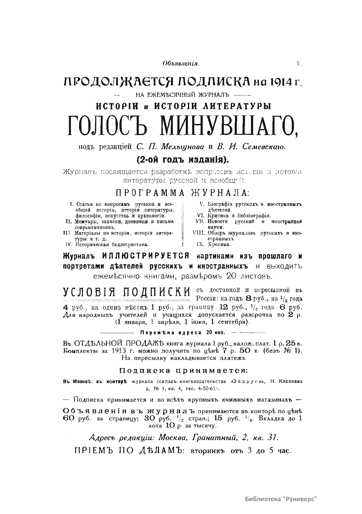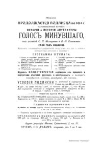 «Голос Минувшего» — журнал истории и истории литературы либерально-народнического направления, издававшийся в Москве с 1913 по 1923 год. Издателем журнала в 1913–1922 годах были известные русские историки, публицисты и общественные деятели С. П. Мельгунов (1880–1956) и В. И. Семевский (1848–1916). В редакционную коллегию также входили А. К. Дживелегов и П. Н. Сакулин. До 1919 «Голос минувшего» выходил ежемесячно, затем нерегулярно, всего было выпущено 65 номеров. В журнале публиковались интереснейшие материалы, посвященные истории литературы и общественных движений в России второй половины XVIII – начала XX веков. Здесь можно найти: статьи по вопросам русской и всеобщей истории, истории литературы, философии, искусства и археологии. В издании представлены: историческая беллетристика, биографии русских и иностранных деятелей, критика и библиография, новости русской и иностранной науки, обзор журналов русских и иностранных, хроника, мемуары, записки, дневники и письма декабристов, видных народовольцев и эсеров, крупных общественных деятелей и царских администраторов, писателей, военачальников и др. Среди авторов: Е. В. Тарле, А. Ф. Кони, А. К. Дживелегов, А. А. Кизеветтер, В. Г. Короленко и др. Стремление сделать журнал интересным для более широкого круга читателей способствовало тому, что в «Голосе Минувшего», хоть и в ограниченном количестве, печатались статьи по истории искусства и помещались иллюстрации: портреты, картины и рисунки, не знакомые или мало знакомые публике. В журнале опубликован целый ряд интересных писем, документов и воспоминаний. Абсолютное большинство текстов никогда не переиздавалось. Журнал снабжен указателями имен за 1913–1922 годы и систематическим указателем содержания.