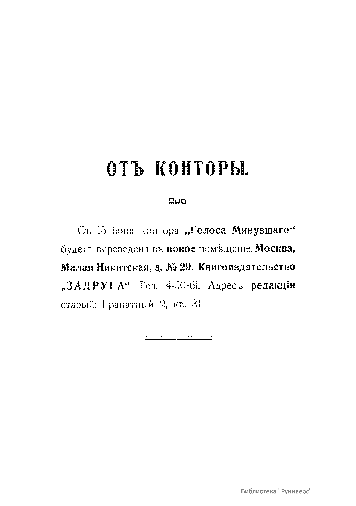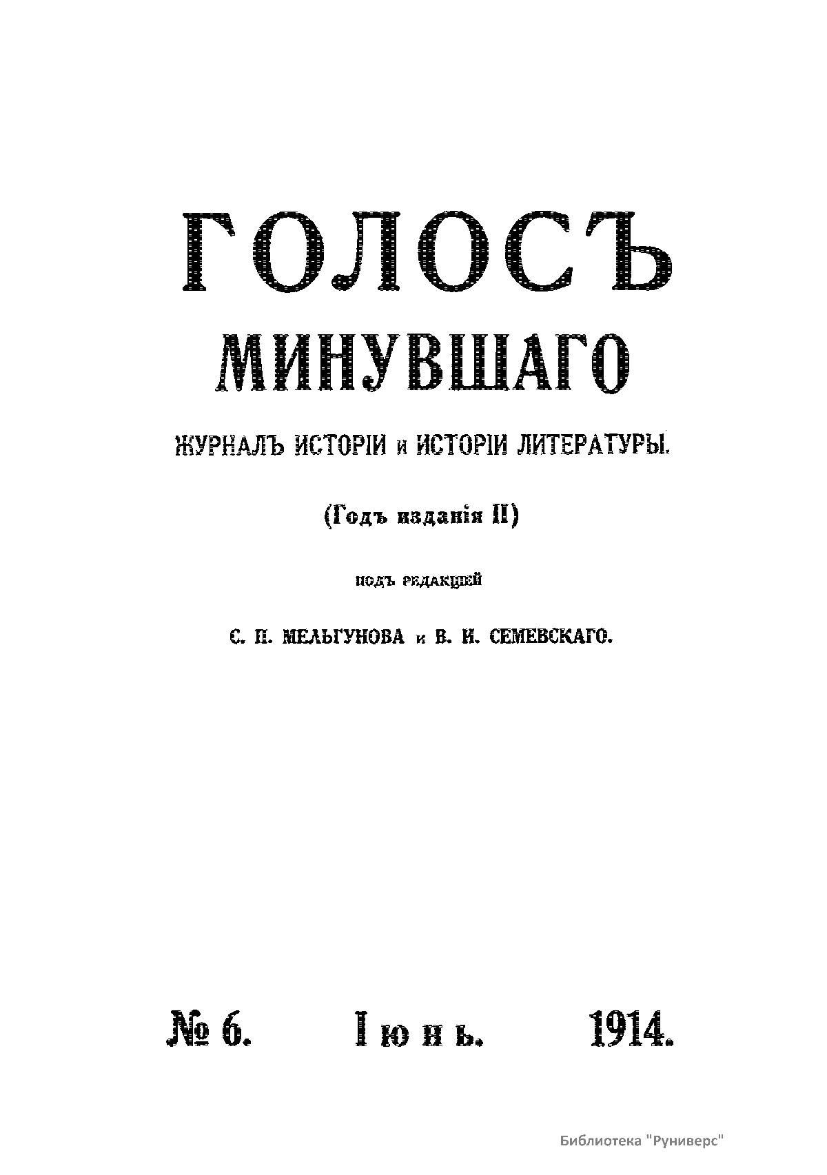«Голос Минувшего» — журнал истории и истории литературы либерально-народнического направления, издававшийся в Москве с 1913 по 1923 год. Издателем журнала в 1913–1922 годах были известные русские историки, публицисты и общественные деятели С. П. Мельгунов (1880–1956) и В. И. Семевский (1848–1916). В редакционную коллегию также входили А. К. Дживелегов и П. Н. Сакулин. До 1919 «Голос минувшего» выходил ежемесячно, затем нерегулярно, всего было выпущено 65 номеров. В журнале публиковались интереснейшие материалы, посвященные истории литературы и общественных движений в России второй половины XVIII – начала XX веков. Здесь можно найти: статьи по вопросам русской и всеобщей истории, истории литературы, философии, искусства и археологии. В издании представлены: историческая беллетристика, биографии русских и иностранных деятелей, критика и библиография, новости русской и иностранной науки, обзор журналов русских и иностранных, хроника, мемуары, записки, дневники и письма декабристов, видных народовольцев и эсеров, крупных общественных деятелей и царских администраторов, писателей, военачальников и др. Среди авторов: Е. В. Тарле, А. Ф. Кони, А. К. Дживелегов, А. А. Кизеветтер, В. Г. Короленко и др. Стремление сделать журнал интересным для более широкого круга читателей способствовало тому, что в «Голосе Минувшего», хоть и в ограниченном количестве, печатались статьи по истории искусства и помещались иллюстрации: портреты, картины и рисунки, не знакомые или мало знакомые публике. В журнале опубликован целый ряд интересных писем, документов и воспоминаний. Абсолютное большинство текстов никогда не переиздавалось. Журнал снабжен указателями имен за 1913–1922 годы и систематическим указателем содержания.