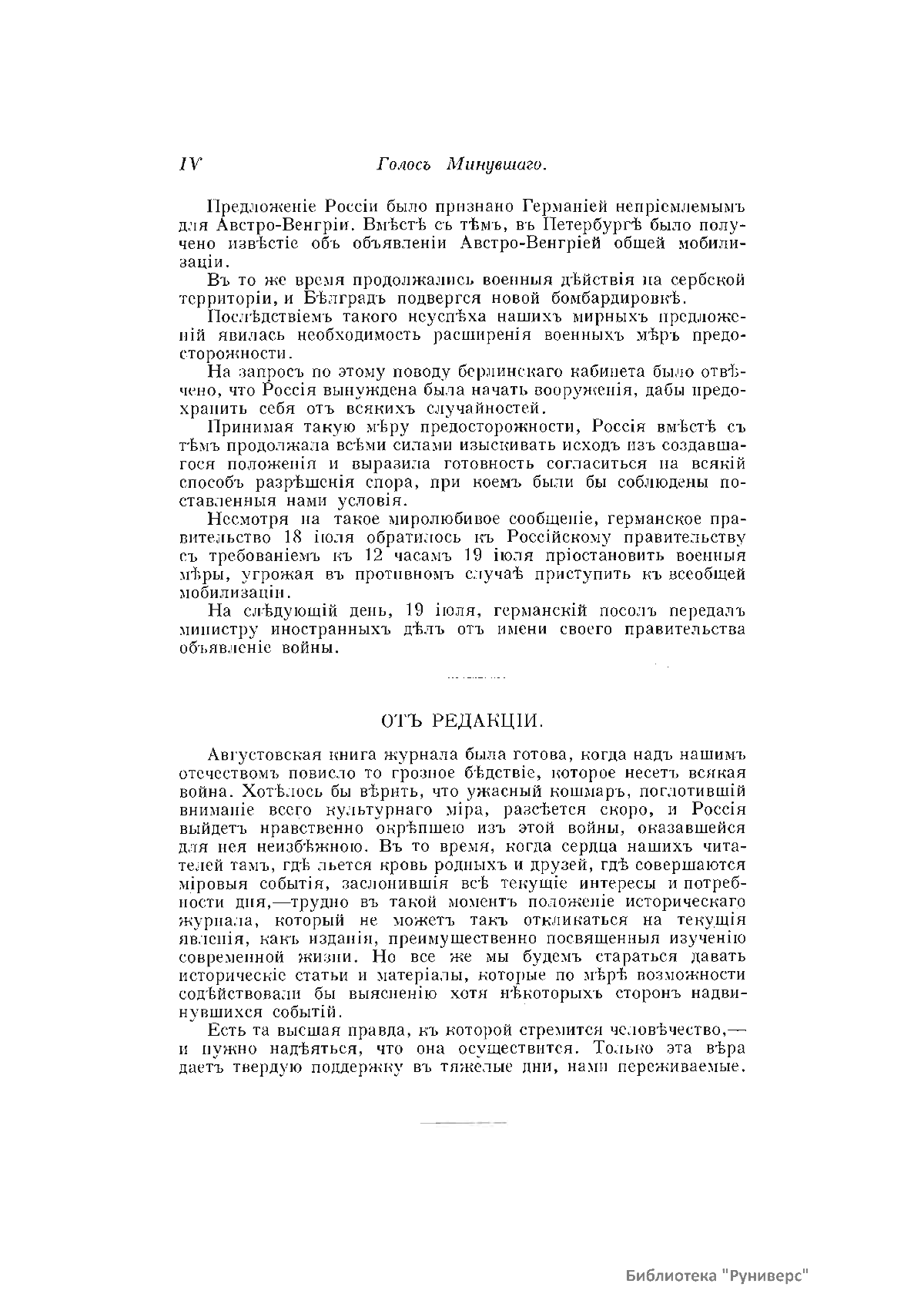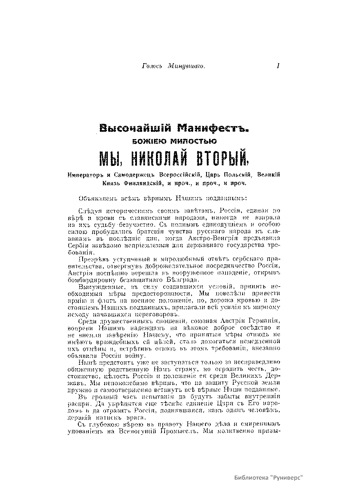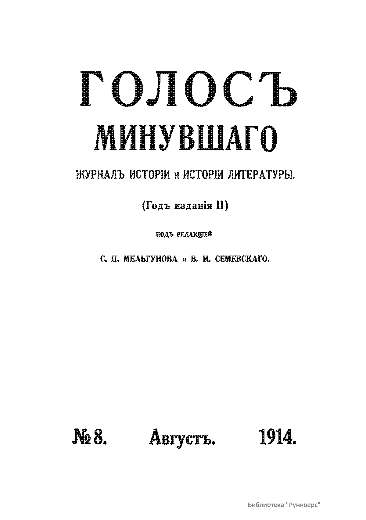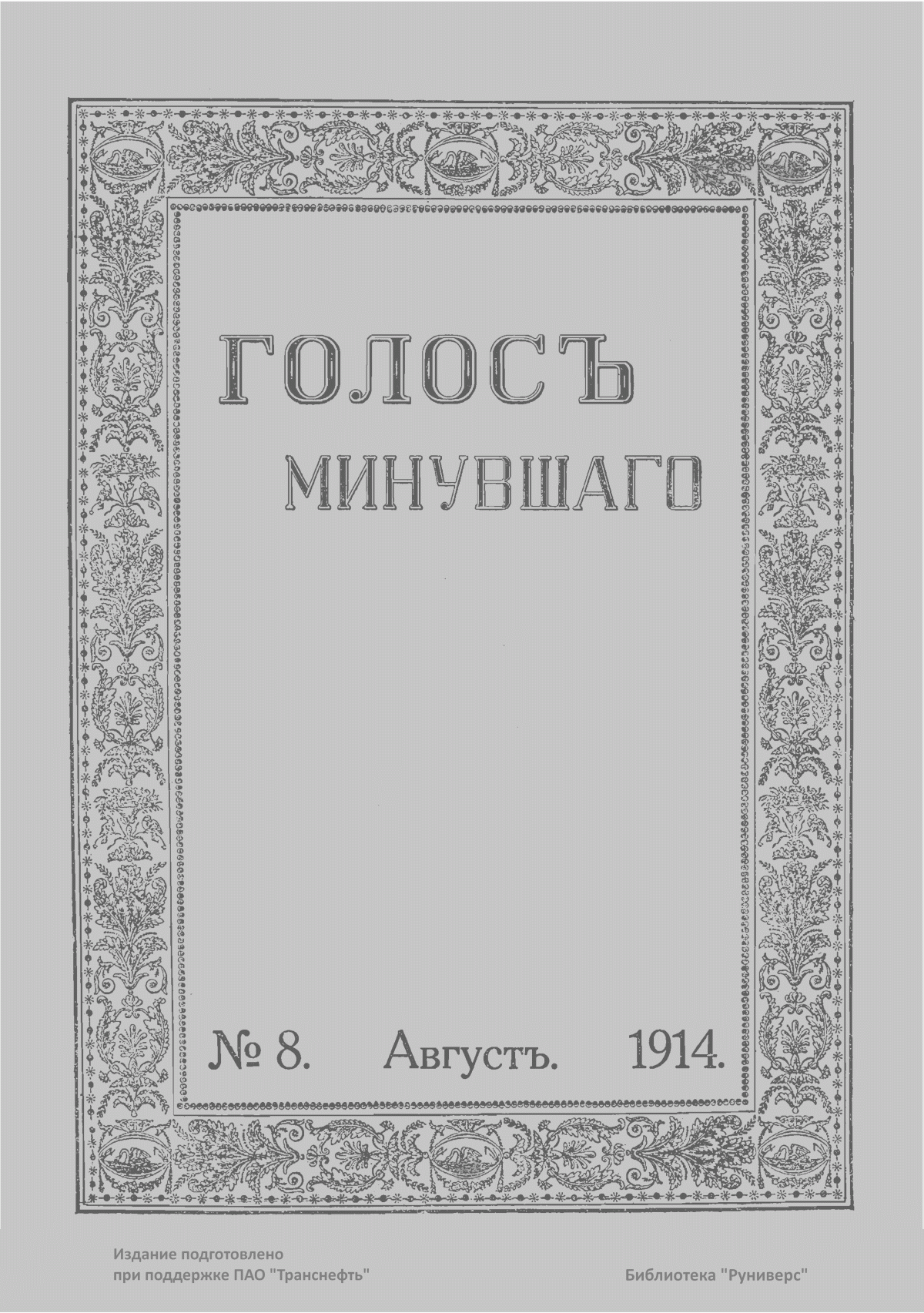 «Голос Минувшего» — журнал истории и истории литературы либерально-народнического направления, издававшийся в Москве с 1913 по 1923 год. Издателем журнала в 1913–1922 годах были известные русские историки, публицисты и общественные деятели С. П. Мельгунов (1880–1956) и В. И. Семевский (1848–1916). В редакционную коллегию также входили А. К. Дживелегов и П. Н. Сакулин. До 1919 «Голос минувшего» выходил ежемесячно, затем нерегулярно, всего было выпущено 65 номеров. В журнале публиковались интереснейшие материалы, посвященные истории литературы и общественных движений в России второй половины XVIII – начала XX веков. Здесь можно найти: статьи по вопросам русской и всеобщей истории, истории литературы, философии, искусства и археологии. В издании представлены: историческая беллетристика, биографии русских и иностранных деятелей, критика и библиография, новости русской и иностранной науки, обзор журналов русских и иностранных, хроника, мемуары, записки, дневники и письма декабристов, видных народовольцев и эсеров, крупных общественных деятелей и царских администраторов, писателей, военачальников и др. Среди авторов: Е. В. Тарле, А. Ф. Кони, А. К. Дживелегов, А. А. Кизеветтер, В. Г. Короленко и др. Стремление сделать журнал интересным для более широкого круга читателей способствовало тому, что в «Голосе Минувшего», хоть и в ограниченном количестве, печатались статьи по истории искусства и помещались иллюстрации: портреты, картины и рисунки, не знакомые или мало знакомые публике. В журнале опубликован целый ряд интересных писем, документов и воспоминаний. Абсолютное большинство текстов никогда не переиздавалось. Журнал снабжен указателями имен за 1913–1922 годы и систематическим указателем содержания.