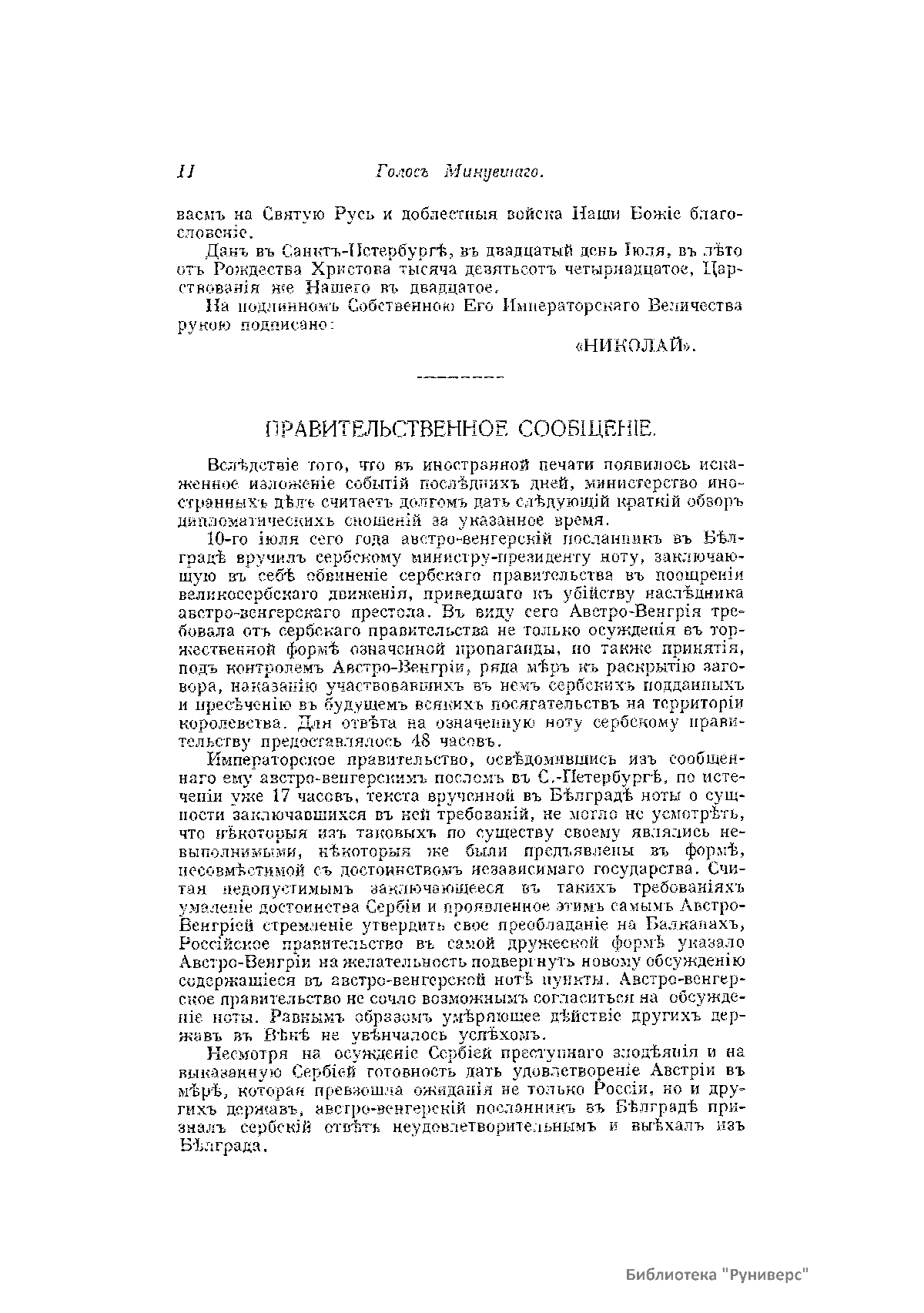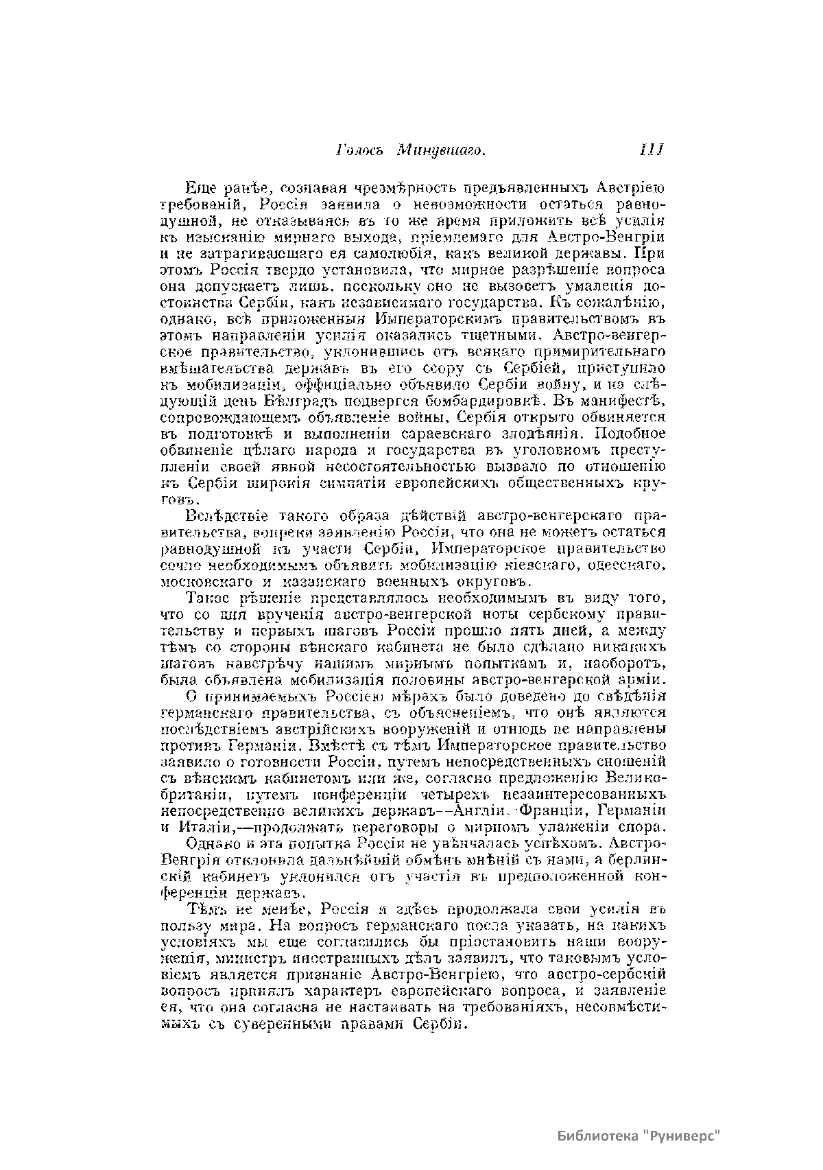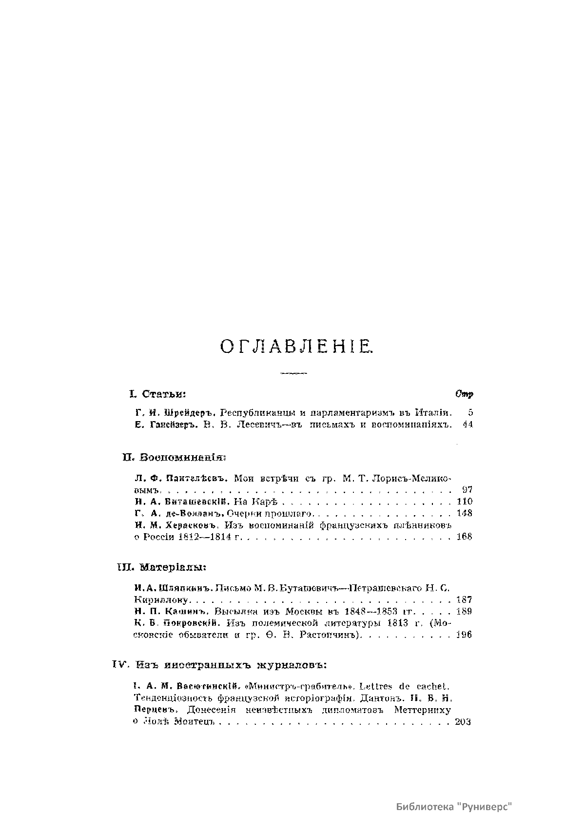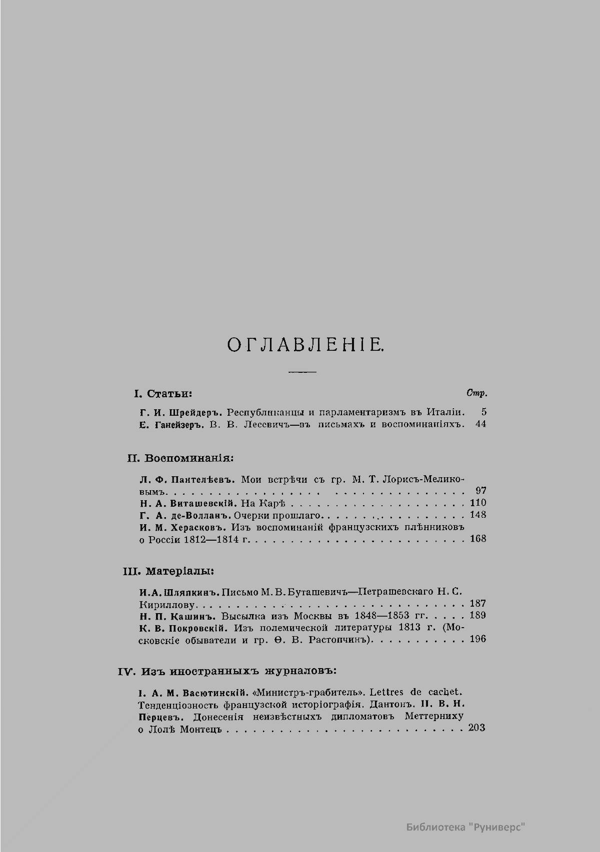 «Голос Минувшего» — журнал истории и истории литературы либерально-народнического направления, издававшийся в Москве с 1913 по 1923 год. Издателем журнала в 1913–1922 годах были известные русские историки, публицисты и общественные деятели С. П. Мельгунов (1880–1956) и В. И. Семевский (1848–1916). В редакционную коллегию также входили А. К. Дживелегов и П. Н. Сакулин. До 1919 «Голос минувшего» выходил ежемесячно, затем нерегулярно, всего было выпущено 65 номеров. В журнале публиковались интереснейшие материалы, посвященные истории литературы и общественных движений в России второй половины XVIII – начала XX веков. Здесь можно найти: статьи по вопросам русской и всеобщей истории, истории литературы, философии, искусства и археологии. В издании представлены: историческая беллетристика, биографии русских и иностранных деятелей, критика и библиография, новости русской и иностранной науки, обзор журналов русских и иностранных, хроника, мемуары, записки, дневники и письма декабристов, видных народовольцев и эсеров, крупных общественных деятелей и царских администраторов, писателей, военачальников и др. Среди авторов: Е. В. Тарле, А. Ф. Кони, А. К. Дживелегов, А. А. Кизеветтер, В. Г. Короленко и др. Стремление сделать журнал интересным для более широкого круга читателей способствовало тому, что в «Голосе Минувшего», хоть и в ограниченном количестве, печатались статьи по истории искусства и помещались иллюстрации: портреты, картины и рисунки, не знакомые или мало знакомые публике. В журнале опубликован целый ряд интересных писем, документов и воспоминаний. Абсолютное большинство текстов никогда не переиздавалось. Журнал снабжен указателями имен за 1913–1922 годы и систематическим указателем содержания.