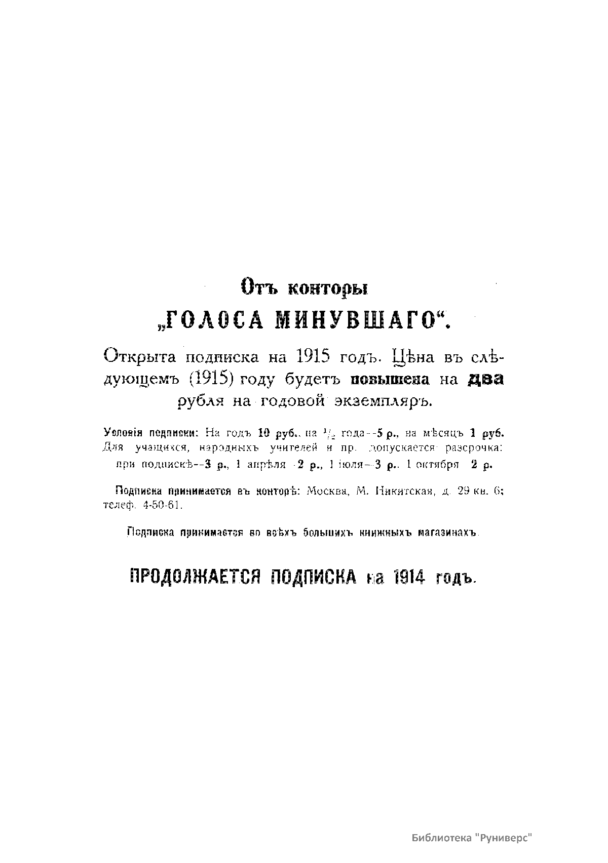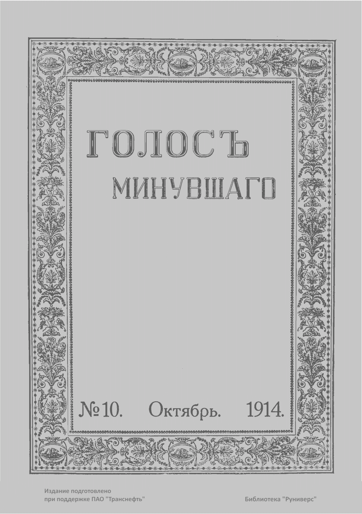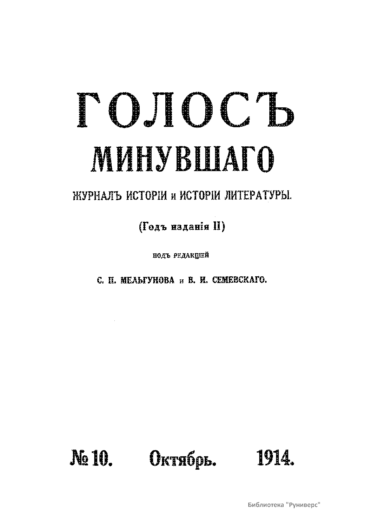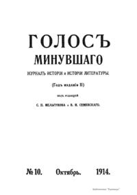 «Голос Минувшего» — журнал истории и истории литературы либерально-народнического направления, издававшийся в Москве с 1913 по 1923 год. Издателем журнала в 1913–1922 годах были известные русские историки, публицисты и общественные деятели С. П. Мельгунов (1880–1956) и В. И. Семевский (1848–1916). В редакционную коллегию также входили А. К. Дживелегов и П. Н. Сакулин. До 1919 «Голос минувшего» выходил ежемесячно, затем нерегулярно, всего было выпущено 65 номеров. В журнале публиковались интереснейшие материалы, посвященные истории литературы и общественных движений в России второй половины XVIII – начала XX веков. Здесь можно найти: статьи по вопросам русской и всеобщей истории, истории литературы, философии, искусства и археологии. В издании представлены: историческая беллетристика, биографии русских и иностранных деятелей, критика и библиография, новости русской и иностранной науки, обзор журналов русских и иностранных, хроника, мемуары, записки, дневники и письма декабристов, видных народовольцев и эсеров, крупных общественных деятелей и царских администраторов, писателей, военачальников и др. Среди авторов: Е. В. Тарле, А. Ф. Кони, А. К. Дживелегов, А. А. Кизеветтер, В. Г. Короленко и др. Стремление сделать журнал интересным для более широкого круга читателей способствовало тому, что в «Голосе Минувшего», хоть и в ограниченном количестве, печатались статьи по истории искусства и помещались иллюстрации: портреты, картины и рисунки, не знакомые или мало знакомые публике. В журнале опубликован целый ряд интересных писем, документов и воспоминаний. Абсолютное большинство текстов никогда не переиздавалось. Журнал снабжен указателями имен за 1913–1922 годы и систематическим указателем содержания.
