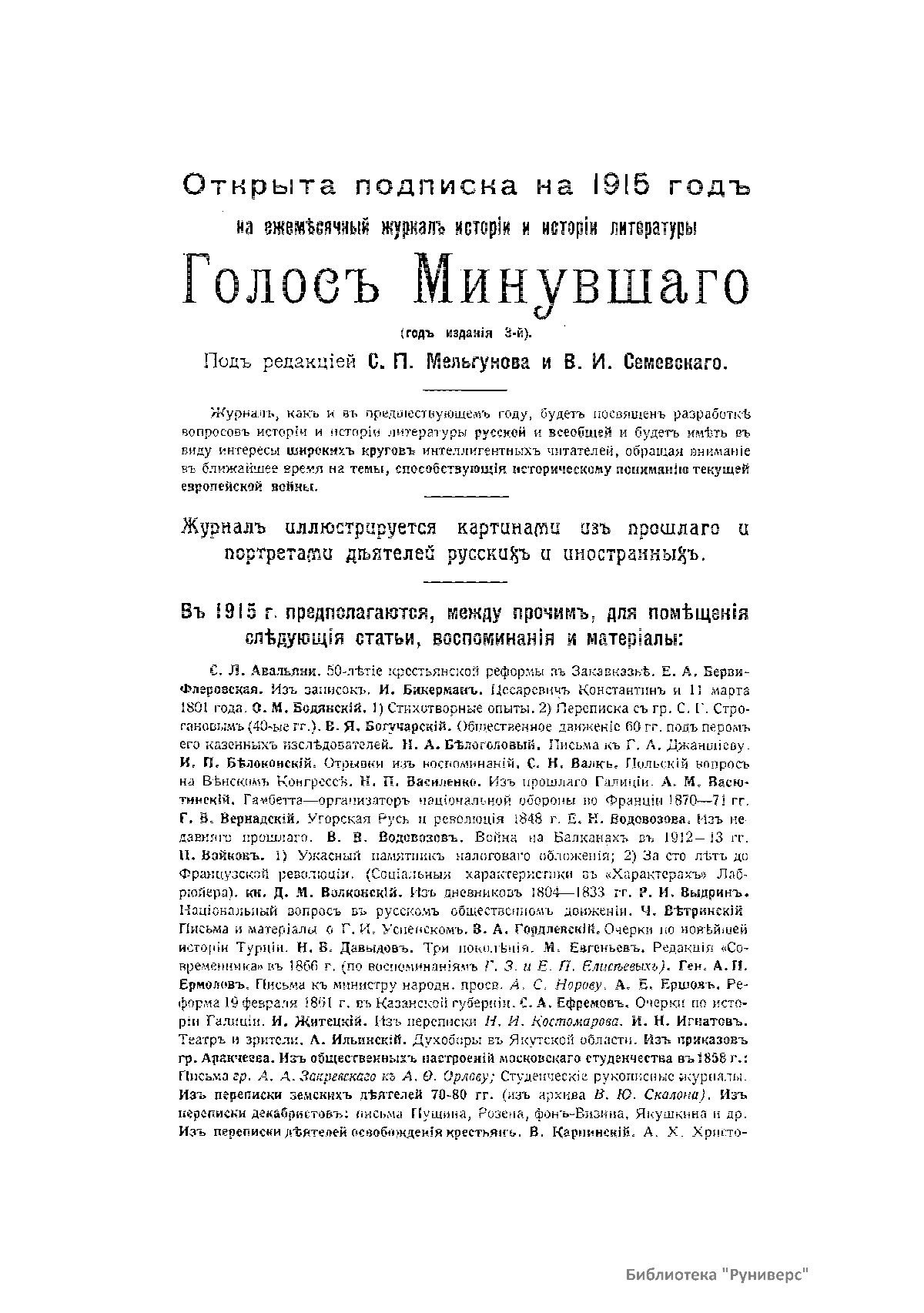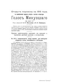 «Голос Минувшего» — журнал истории и истории литературы либерально-народнического направления, издававшийся в Москве с 1913 по 1923 год. Издателем журнала в 1913–1922 годах были известные русские историки, публицисты и общественные деятели С. П. Мельгунов (1880–1956) и В. И. Семевский (1848–1916). В редакционную коллегию также входили А. К. Дживелегов и П. Н. Сакулин. До 1919 «Голос минувшего» выходил ежемесячно, затем нерегулярно, всего было выпущено 65 номеров. В журнале публиковались интереснейшие материалы, посвященные истории литературы и общественных движений в России второй половины XVIII – начала XX веков. Здесь можно найти: статьи по вопросам русской и всеобщей истории, истории литературы, философии, искусства и археологии. В издании представлены: историческая беллетристика, биографии русских и иностранных деятелей, критика и библиография, новости русской и иностранной науки, обзор журналов русских и иностранных, хроника, мемуары, записки, дневники и письма декабристов, видных народовольцев и эсеров, крупных общественных деятелей и царских администраторов, писателей, военачальников и др. Среди авторов: Е. В. Тарле, А. Ф. Кони, А. К. Дживелегов, А. А. Кизеветтер, В. Г. Короленко и др. Стремление сделать журнал интересным для более широкого круга читателей способствовало тому, что в «Голосе Минувшего», хоть и в ограниченном количестве, печатались статьи по истории искусства и помещались иллюстрации: портреты, картины и рисунки, не знакомые или мало знакомые публике. В журнале опубликован целый ряд интересных писем, документов и воспоминаний. Абсолютное большинство текстов никогда не переиздавалось. Журнал снабжен указателями имен за 1913–1922 годы и систематическим указателем содержания.