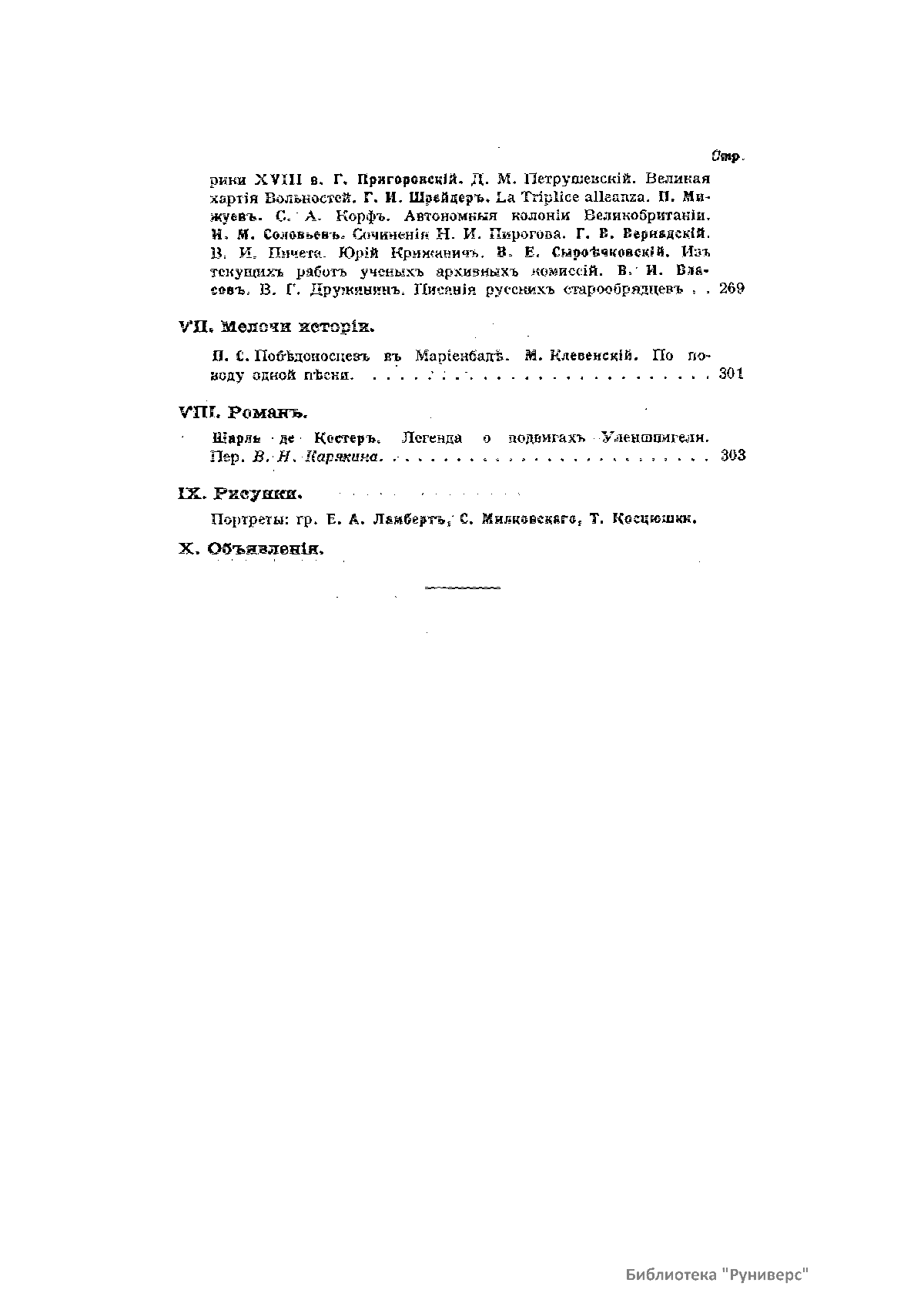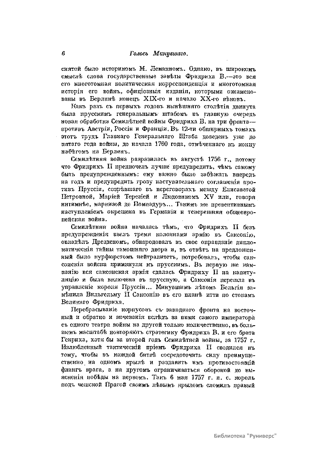 «Голос Минувшего» — журнал истории и истории литературы либерально-народнического направления, издававшийся в Москве с 1913 по 1923 год. Издателем журнала в 1913–1922 годах были известные русские историки, публицисты и общественные деятели С. П. Мельгунов (1880–1956) и В. И. Семевский (1848–1916). В редакционную коллегию также входили А. К. Дживелегов и П. Н. Сакулин. До 1919 «Голос минувшего» выходил ежемесячно, затем нерегулярно, всего было выпущено 65 номеров. В журнале публиковались интереснейшие материалы, посвященные истории литературы и общественных движений в России второй половины XVIII – начала XX веков. Здесь можно найти: статьи по вопросам русской и всеобщей истории, истории литературы, философии, искусства и археологии. В издании представлены: историческая беллетристика, биографии русских и иностранных деятелей, критика и библиография, новости русской и иностранной науки, обзор журналов русских и иностранных, хроника, мемуары, записки, дневники и письма декабристов, видных народовольцев и эсеров, крупных общественных деятелей и царских администраторов, писателей, военачальников и др. Среди авторов: Е. В. Тарле, А. Ф. Кони, А. К. Дживелегов, А. А. Кизеветтер, В. Г. Короленко и др. Стремление сделать журнал интересным для более широкого круга читателей способствовало тому, что в «Голосе Минувшего», хоть и в ограниченном количестве, печатались статьи по истории искусства и помещались иллюстрации: портреты, картины и рисунки, не знакомые или мало знакомые публике. В журнале опубликован целый ряд интересных писем, документов и воспоминаний. Абсолютное большинство текстов никогда не переиздавалось. Журнал снабжен указателями имен за 1913–1922 годы и систематическим указателем содержания.