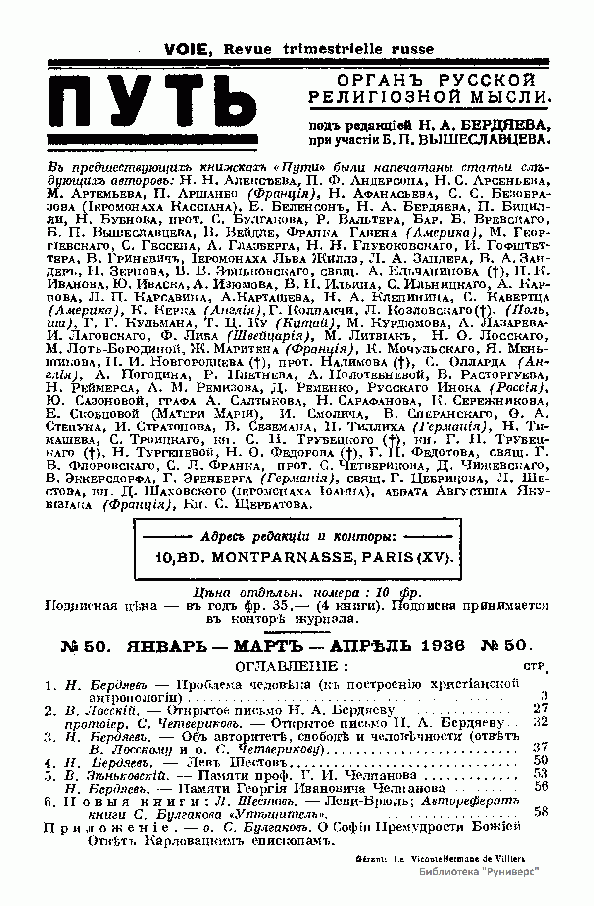 Путь: Орган русской религиозной мысли. №50. Январь-Март-Апрель 1936