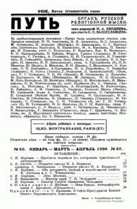 «Путь: Орган русской религиозной мысли» – журнал, издававшийся в Париже с сентября 1925 г. по март 1940 г., собравший на своих страницах все философские и богословские силы русской эмиграции. В редакционной статье «Духовные задачи русской эмиграции» («Путь», № 1. Сентябрь 1925 г.) отмечалось, что журнал ставит своей целью сохранение преемственности в процессе существования русской духовной культуры, а также стремится к преодолению сформировавшейся к тому времени эмигрантской психологии, сильно политизированной и противоречивой в своем отношении к Русской Православной Церкви и Советской России, что создавало угрозу раскола русской эмиграции.