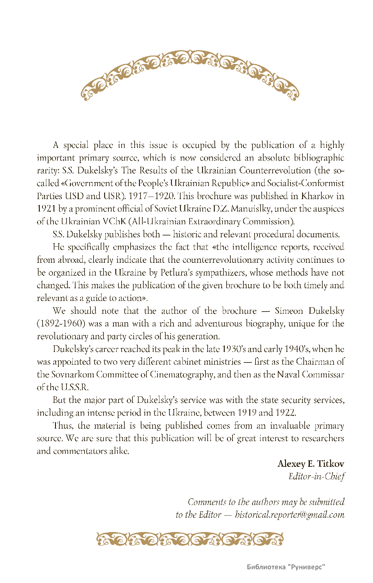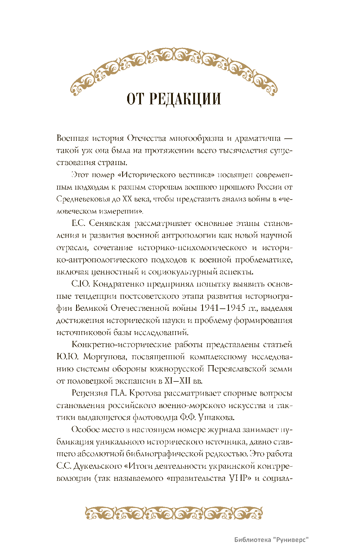 Дорогие коллеги, мы представляем вам первый номер «Исторического вестника», который одновременно обозначается 148-м томом, тем самым продолжая дореволюционное издание. Однако, перешагивая почти сто лет, мы понимаем, что реалии XXI века определяют и новое содержание журнала. История сегодня во многом актуализирована политикой. Именно геополитическая ситуация в мире, возвращающая нас к вопросам сохранения существующих границ, национальных и культурных ценностей, моральных и религиозных принципов, формирует еще одно измерение — проблему аутентичного исторического бытования народов и государств. С одной стороны, это вопрос географических ареалов государственных образований, с другой — тема, связанная с соприкосновением, взаимодействием процессов, культур и традиций. Во многом мы стоим и перед важнейшей этической проблемой. Мы должны не только вежливо и настойчиво указывать нашим уважаемым соседям на свои исторические права, но и сами уходить от искушения искусственного удревнения собственной истории или присвоения чужой. И здесь на сцену выходит его величество Исторический Научный Факт. Он и есть главный цензор и законодатель. На этом незыблемом основании будет строиться редакционная и научная работа «Исторического вестника».