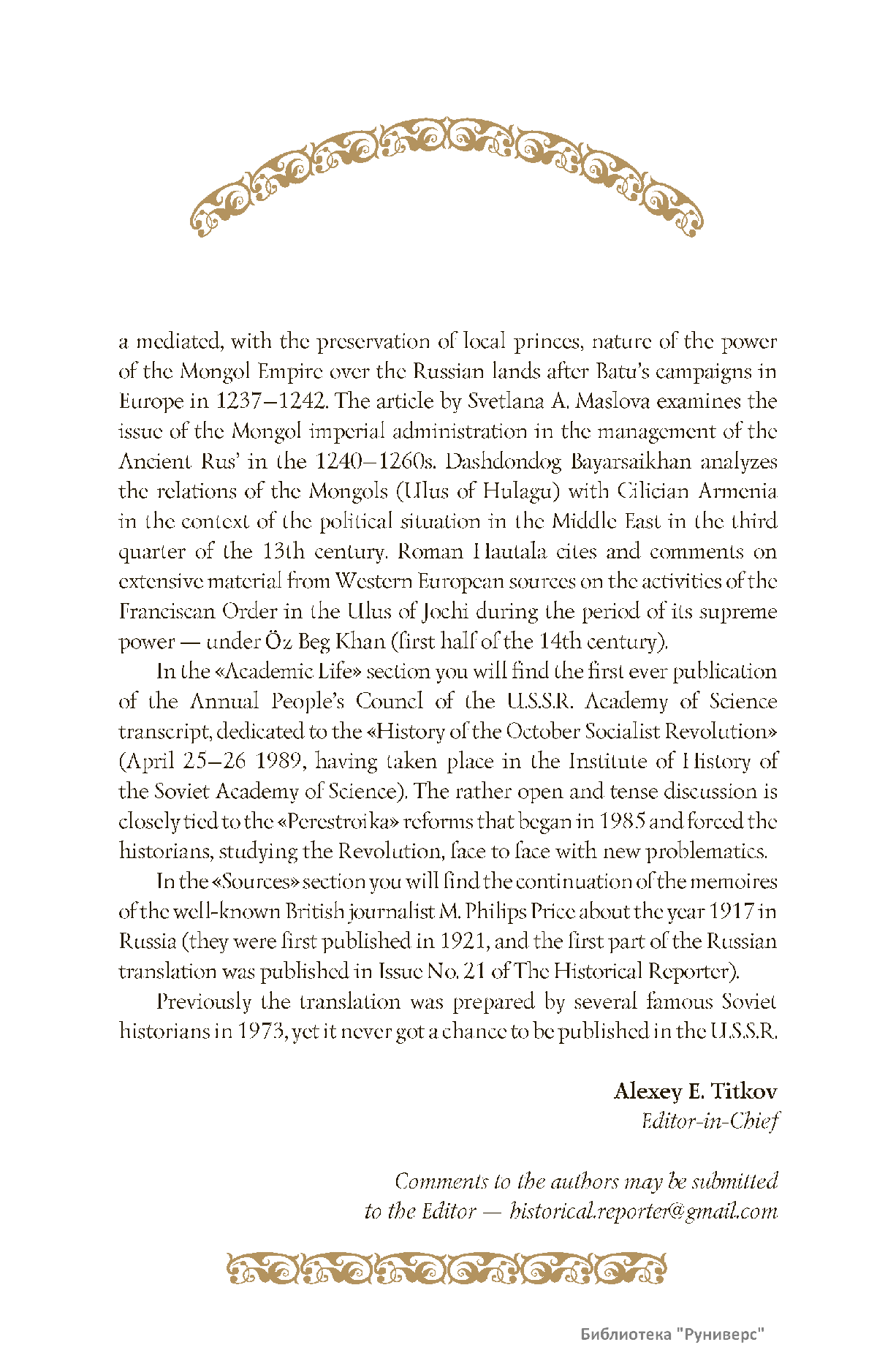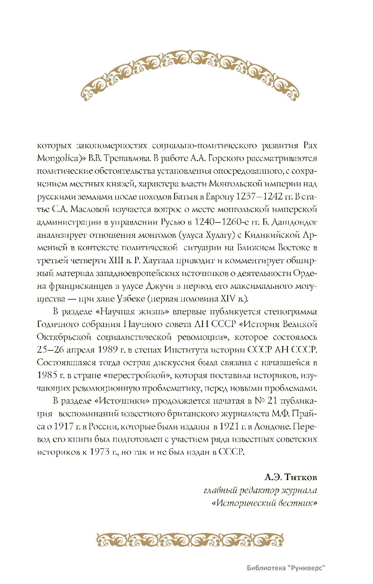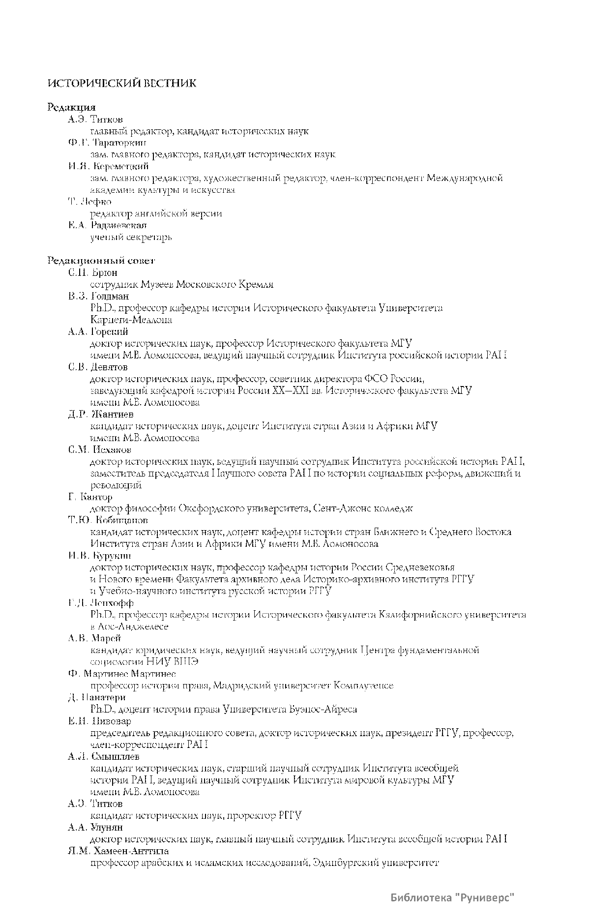 Дорогие коллеги, мы представляем вам первый номер «Исторического вестника», который одновременно обозначается 148-м томом, тем самым продолжая дореволюционное издание. Однако, перешагивая почти сто лет, мы понимаем, что реалии XXI века определяют и новое содержание журнала. История сегодня во многом актуализирована политикой. Именно геополитическая ситуация в мире, возвращающая нас к вопросам сохранения существующих границ, национальных и культурных ценностей, моральных и религиозных принципов, формирует еще одно измерение — проблему аутентичного исторического бытования народов и государств. С одной стороны, это вопрос географических ареалов государственных образований, с другой — тема, связанная с соприкосновением, взаимодействием процессов, культур и традиций. Во многом мы стоим и перед важнейшей этической проблемой. Мы должны не только вежливо и настойчиво указывать нашим уважаемым соседям на свои исторические права, но и сами уходить от искушения искусственного удревнения собственной истории или присвоения чужой. И здесь на сцену выходит его величество Исторический Научный Факт. Он и есть главный цензор и законодатель. На этом незыблемом основании будет строиться редакционная и научная работа «Исторического вестника».