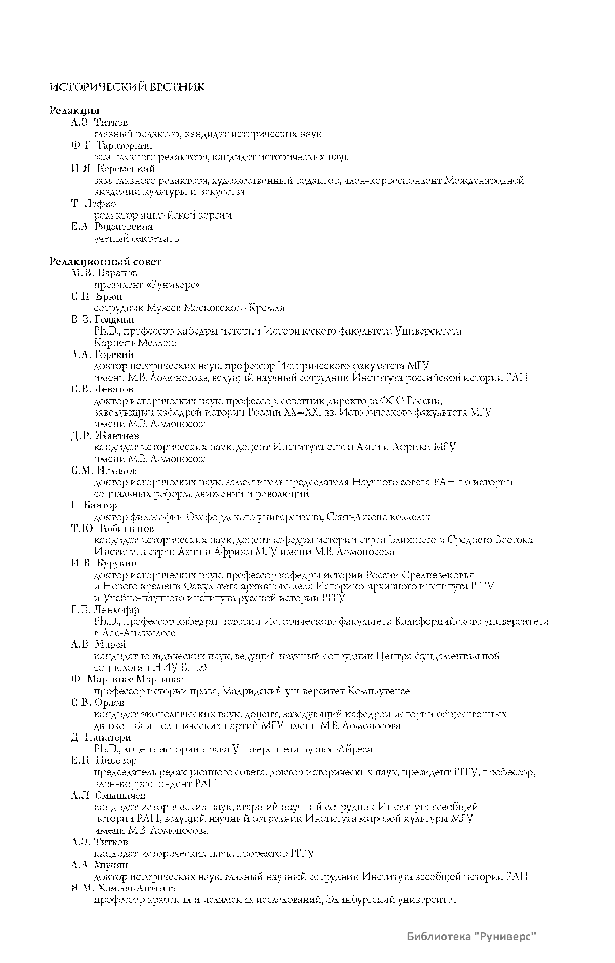 Дорогие коллеги, мы представляем вам первый номер «Исторического вестника», который одновременно обозначается 148-м томом, тем самым продолжая дореволюционное издание. Однако, перешагивая почти сто лет, мы понимаем, что реалии XXI века определяют и новое содержание журнала. История сегодня во многом актуализирована политикой. Именно геополитическая ситуация в мире, возвращающая нас к вопросам сохранения существующих границ, национальных и культурных ценностей, моральных и религиозных принципов, формирует еще одно измерение — проблему аутентичного исторического бытования народов и государств. С одной стороны, это вопрос географических ареалов государственных образований, с другой — тема, связанная с соприкосновением, взаимодействием процессов, культур и традиций. Во многом мы стоим и перед важнейшей этической проблемой. Мы должны не только вежливо и настойчиво указывать нашим уважаемым соседям на свои исторические права, но и сами уходить от искушения искусственного удревнения собственной истории или присвоения чужой. И здесь на сцену выходит его величество Исторический Научный Факт. Он и есть главный цензор и законодатель. На этом незыблемом основании будет строиться редакционная и научная работа «Исторического вестника».