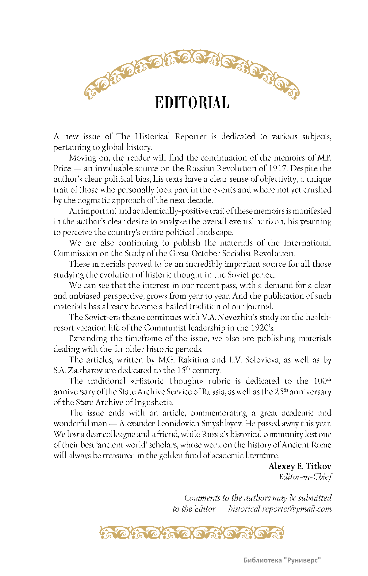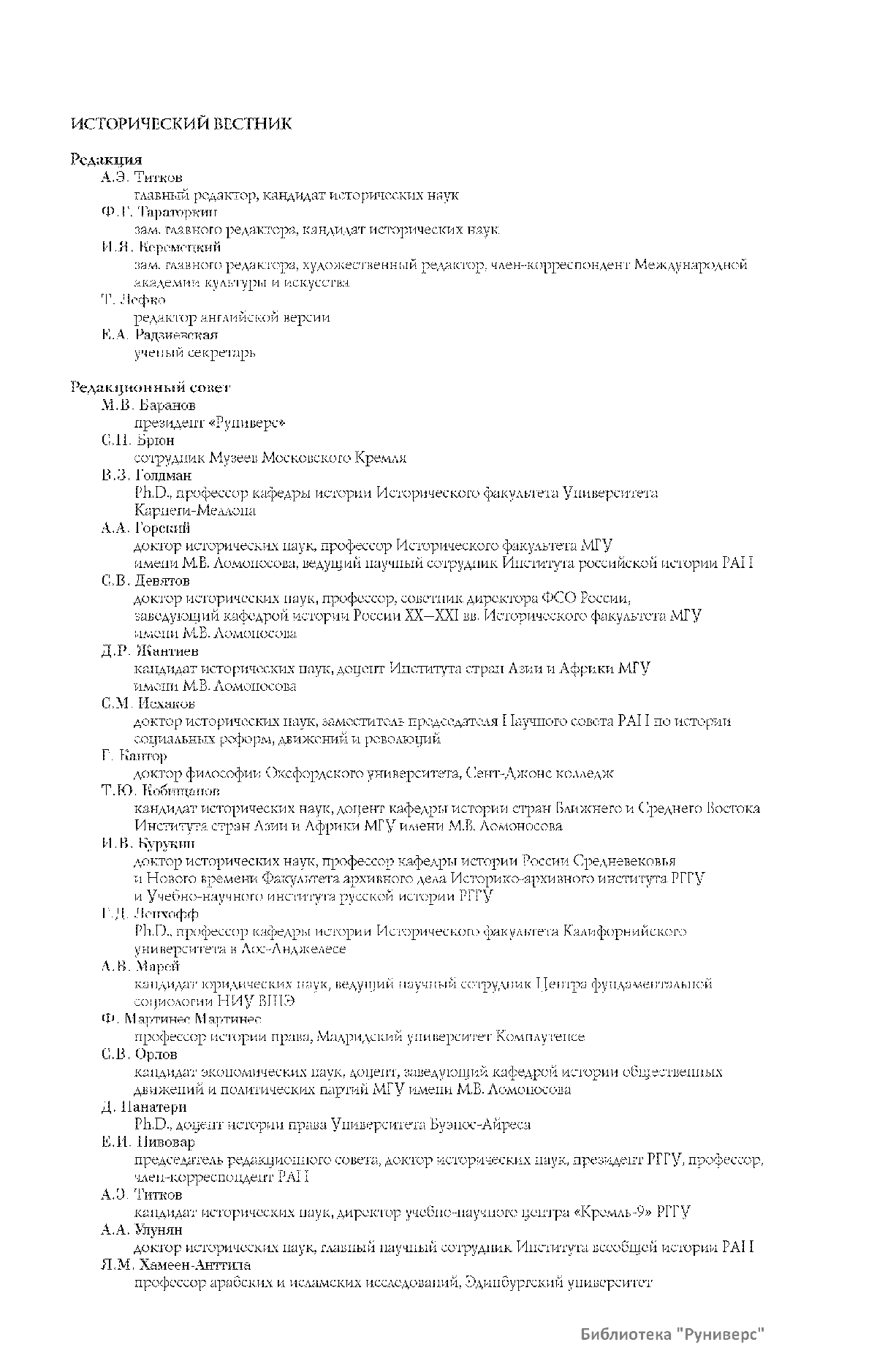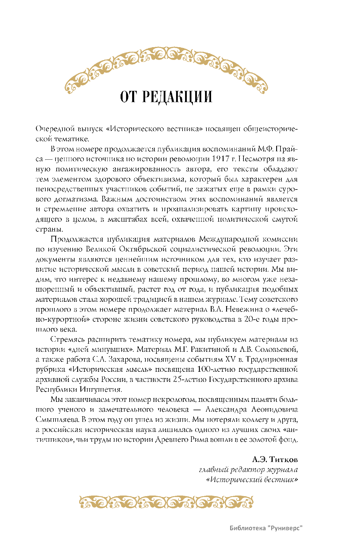Дорогие коллеги, мы представляем вам первый номер «Исторического вестника», который одновременно обозначается 148-м томом, тем самым продолжая дореволюционное издание. Однако, перешагивая почти сто лет, мы понимаем, что реалии XXI века определяют и новое содержание журнала. История сегодня во многом актуализирована политикой. Именно геополитическая ситуация в мире, возвращающая нас к вопросам сохранения существующих границ, национальных и культурных ценностей, моральных и религиозных принципов, формирует еще одно измерение — проблему аутентичного исторического бытования народов и государств. С одной стороны, это вопрос географических ареалов государственных образований, с другой — тема, связанная с соприкосновением, взаимодействием процессов, культур и традиций. Во многом мы стоим и перед важнейшей этической проблемой. Мы должны не только вежливо и настойчиво указывать нашим уважаемым соседям на свои исторические права, но и сами уходить от искушения искусственного удревнения собственной истории или присвоения чужой. И здесь на сцену выходит его величество Исторический Научный Факт. Он и есть главный цензор и законодатель. На этом незыблемом основании будет строиться редакционная и научная работа «Исторического вестника».