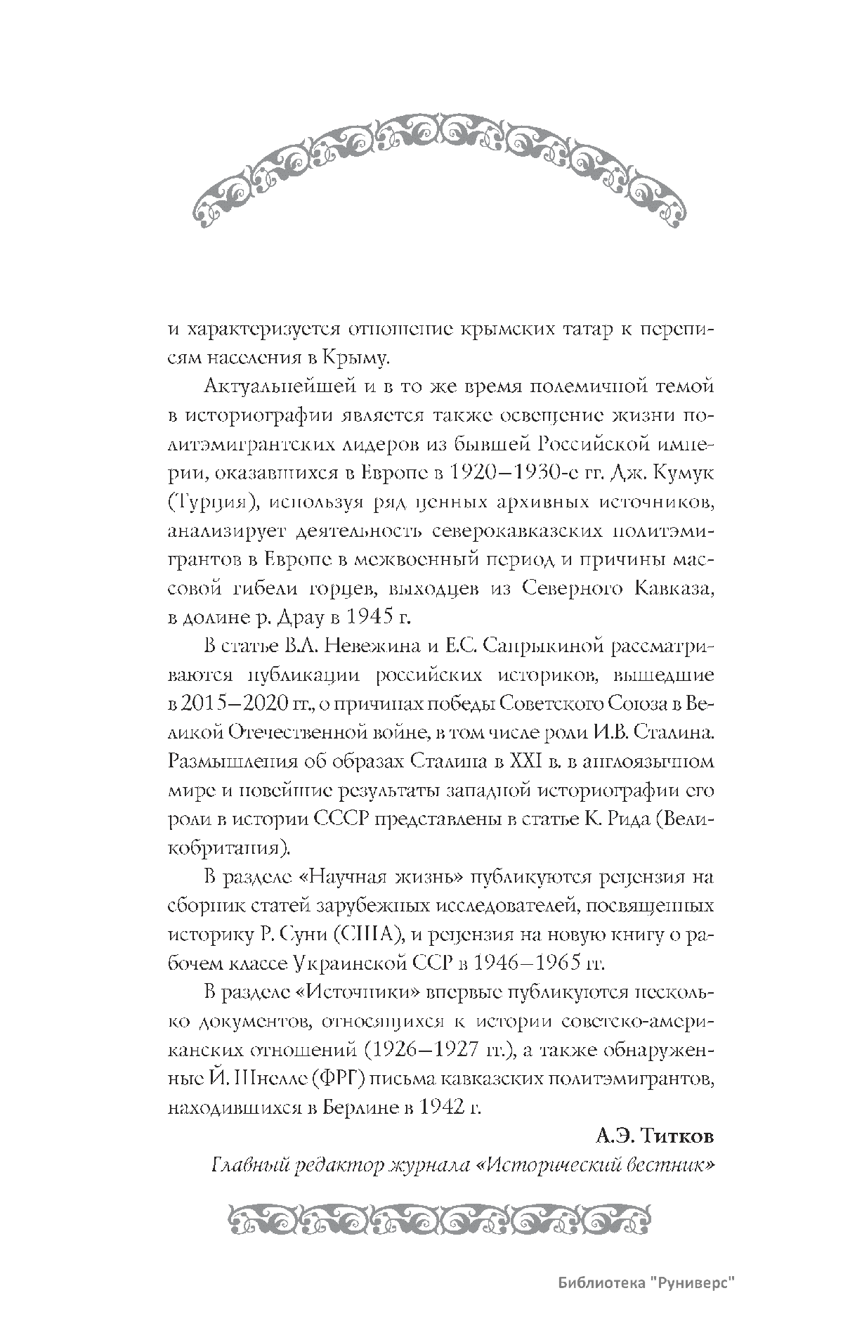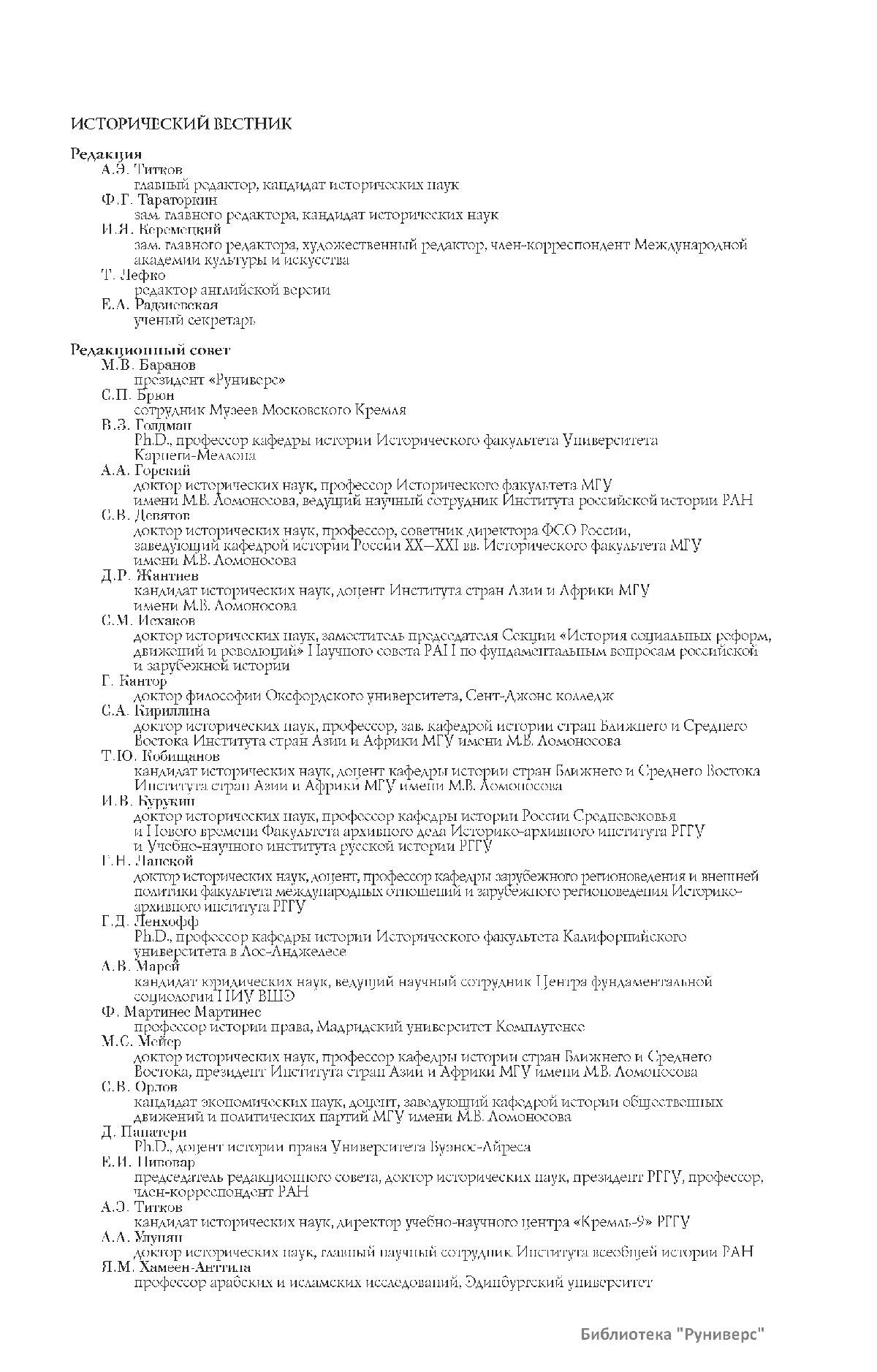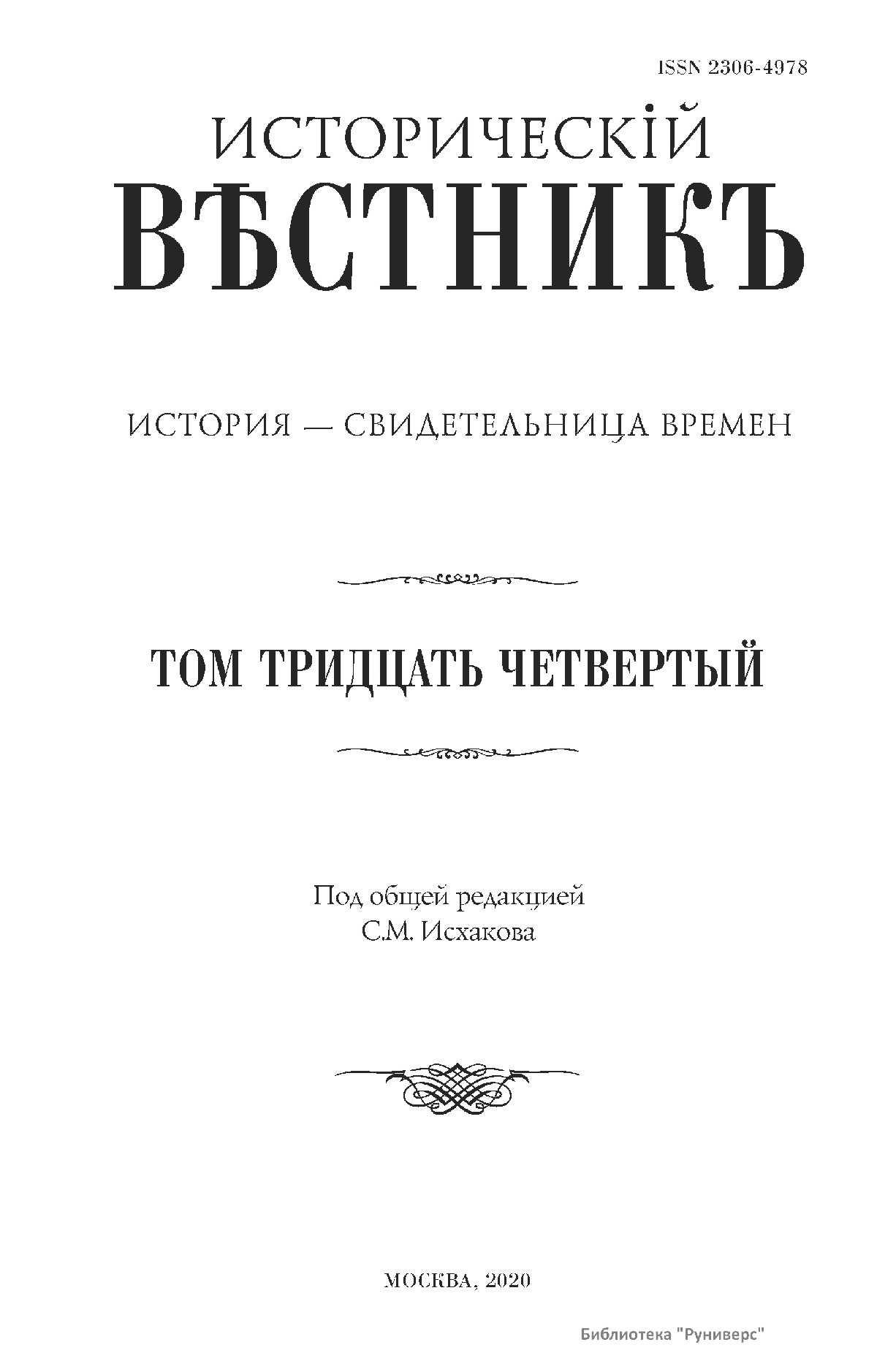 Дорогие коллеги, мы представляем вам первый номер «Исторического вестника», который одновременно обозначается 148-м томом, тем самым продолжая дореволюционное издание. Однако, перешагивая почти сто лет, мы понимаем, что реалии XXI века определяют и новое содержание журнала. История сегодня во многом актуализирована политикой. Именно геополитическая ситуация в мире, возвращающая нас к вопросам сохранения существующих границ, национальных и культурных ценностей, моральных и религиозных принципов, формирует еще одно измерение — проблему аутентичного исторического бытования народов и государств. С одной стороны, это вопрос географических ареалов государственных образований, с другой — тема, связанная с соприкосновением, взаимодействием процессов, культур и традиций. Во многом мы стоим и перед важнейшей этической проблемой. Мы должны не только вежливо и настойчиво указывать нашим уважаемым соседям на свои исторические права, но и сами уходить от искушения искусственного удревнения собственной истории или присвоения чужой. И здесь на сцену выходит его величество Исторический Научный Факт. Он и есть главный цензор и законодатель. На этом незыблемом основании будет строиться редакционная и научная работа «Исторического вестника».