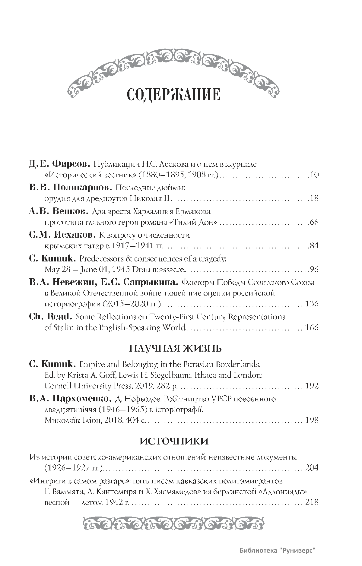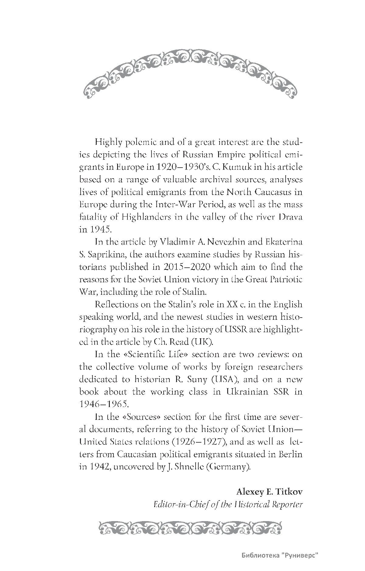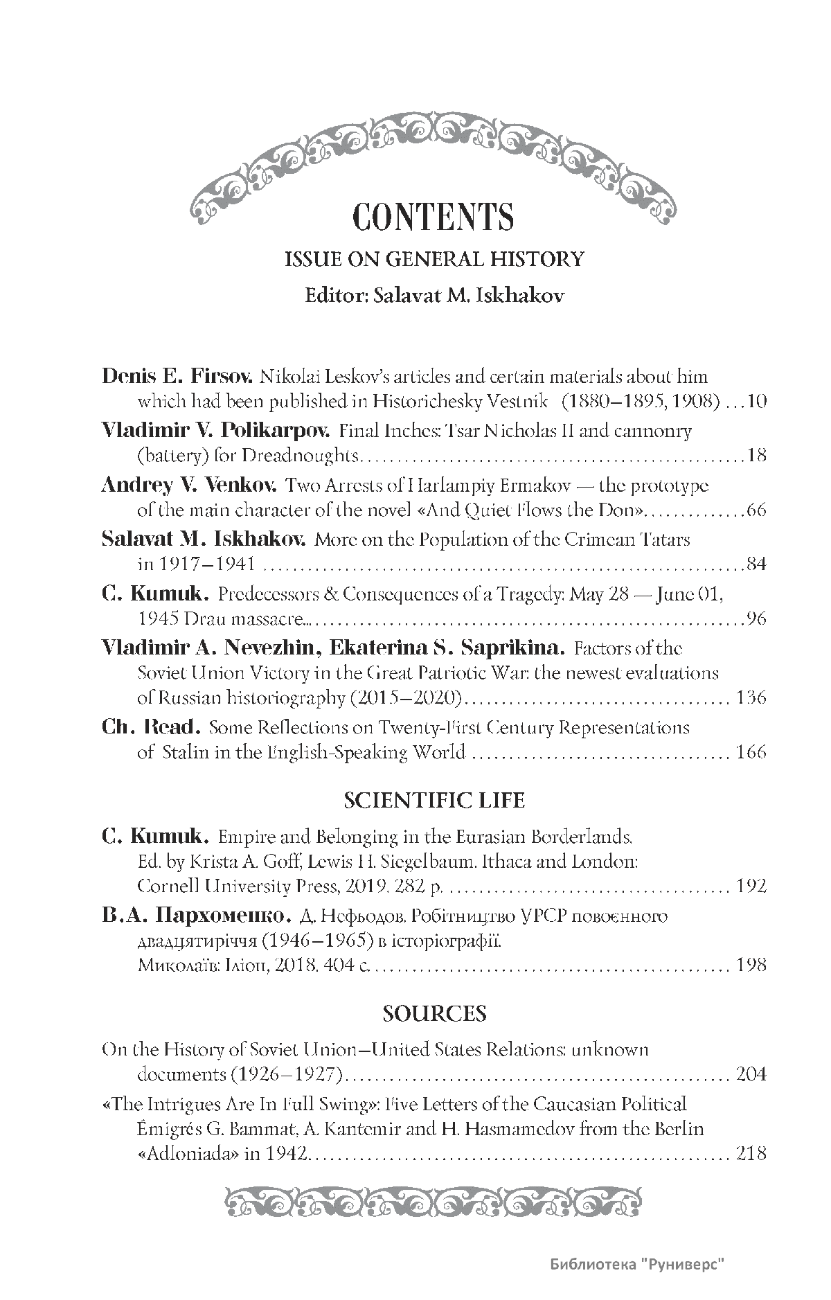 Дорогие коллеги, мы представляем вам первый номер «Исторического вестника», который одновременно обозначается 148-м томом, тем самым продолжая дореволюционное издание. Однако, перешагивая почти сто лет, мы понимаем, что реалии XXI века определяют и новое содержание журнала. История сегодня во многом актуализирована политикой. Именно геополитическая ситуация в мире, возвращающая нас к вопросам сохранения существующих границ, национальных и культурных ценностей, моральных и религиозных принципов, формирует еще одно измерение — проблему аутентичного исторического бытования народов и государств. С одной стороны, это вопрос географических ареалов государственных образований, с другой — тема, связанная с соприкосновением, взаимодействием процессов, культур и традиций. Во многом мы стоим и перед важнейшей этической проблемой. Мы должны не только вежливо и настойчиво указывать нашим уважаемым соседям на свои исторические права, но и сами уходить от искушения искусственного удревнения собственной истории или присвоения чужой. И здесь на сцену выходит его величество Исторический Научный Факт. Он и есть главный цензор и законодатель. На этом незыблемом основании будет строиться редакционная и научная работа «Исторического вестника».