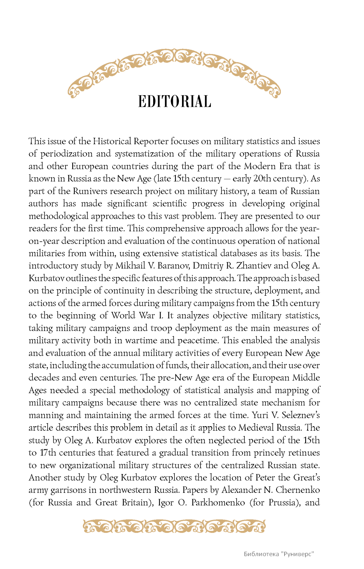 Дорогие коллеги, мы представляем вам первый номер «Исторического вестника», который одновременно обозначается 148-м томом, тем самым продолжая дореволюционное издание. Однако, перешагивая почти сто лет, мы понимаем, что реалии XXI века определяют и новое содержание журнала. История сегодня во многом актуализирована политикой. Именно геополитическая ситуация в мире, возвращающая нас к вопросам сохранения существующих границ, национальных и культурных ценностей, моральных и религиозных принципов, формирует еще одно измерение — проблему аутентичного исторического бытования народов и государств. С одной стороны, это вопрос географических ареалов государственных образований, с другой — тема, связанная с соприкосновением, взаимодействием процессов, культур и традиций. Во многом мы стоим и перед важнейшей этической проблемой. Мы должны не только вежливо и настойчиво указывать нашим уважаемым соседям на свои исторические права, но и сами уходить от искушения искусственного удревнения собственной истории или присвоения чужой. И здесь на сцену выходит его величество Исторический Научный Факт. Он и есть главный цензор и законодатель. На этом незыблемом основании будет строиться редакционная и научная работа «Исторического вестника».