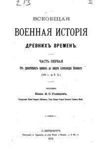 Впервые издана в Петербурге в 1872-1878 гг. Свой капитальный труд «Всеобщая военная история» в 15 томах князь Николай Сергеевич Голицын создал в 1838-47 годах в период профессорско-преподавательской работы в Императорской военной академии, где он руководил кафедрой стратегии и затем — военной истории. На протяжении двадцати лет со времени учреждения академии не существовало учебного пособия на русском языке по военной истории. Голицын, с разрешения академического и высшего начальства, делает первый шаг к восполнению недостатка в военной литературе. Работа Голицына явилась первой в России и Европе попыткой полного систематического изложения всеобщей военной истории и задумывалась автором как руководство к преподаванию и изучению этого предмета.
