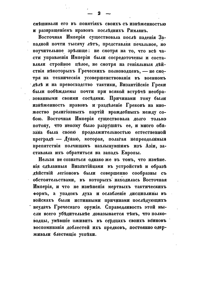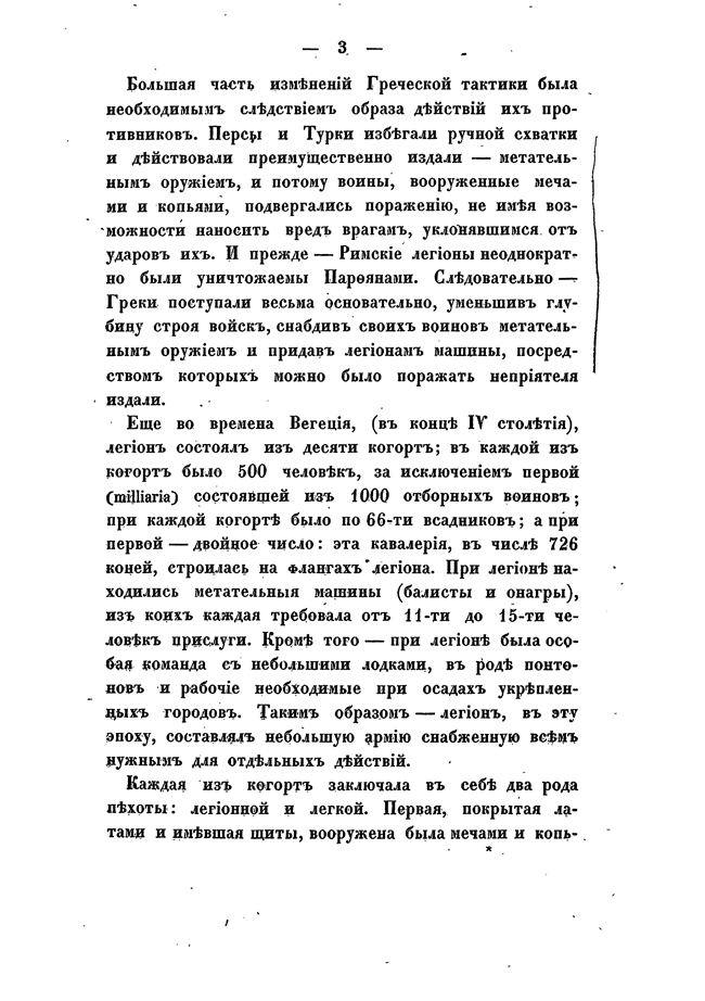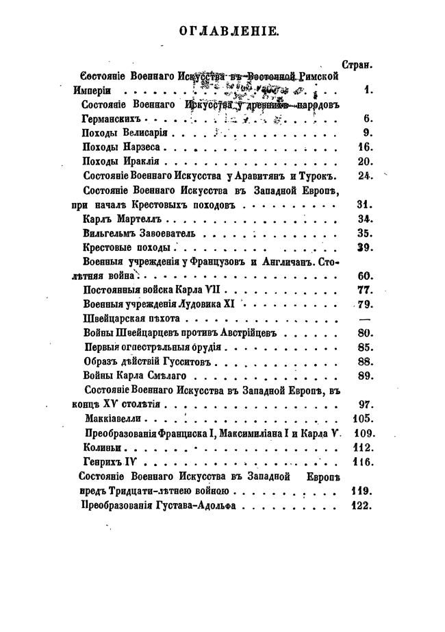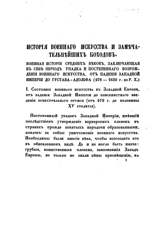 Первая часть охватывает период от начала войн до падения Западной Римской империи и составляет картину возвышения и упадка военного дела у древних народов. Здесь содержатся сведения из истории образа ведения войны древних греков и римлян, военных действий Александра Великого, Аннибала, Сципионов, Цезаря, и военных учреждений Рима.