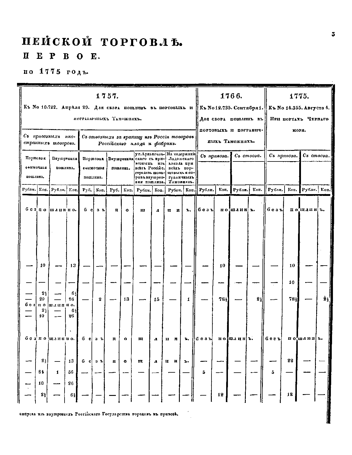 Первое издание 1830 г., составленное под руководством М. М. Сперанского, включает более 30 тысяч законодательных актов с 1649 по 1825 г (45 томов) — время правления Алексея Михайловича — Александра I (33 тома).