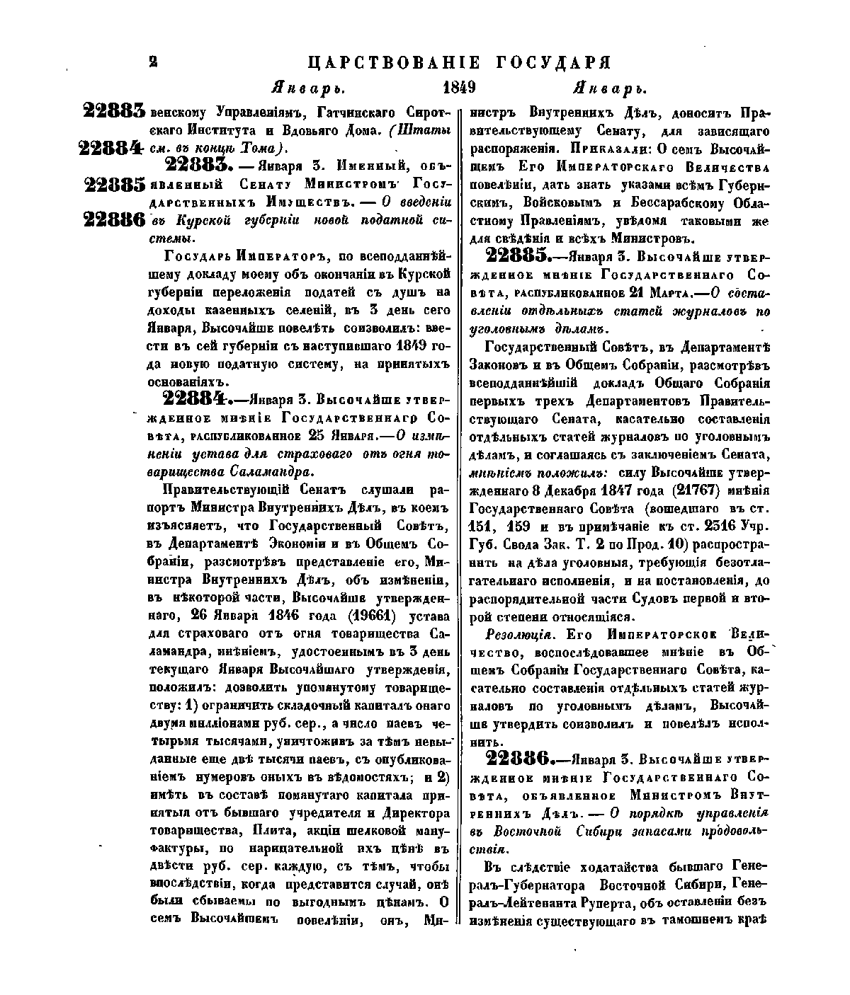 Второе издание выходило ежегодно в 1830-1884 гг., включает более 60 тысяч законодательных актов с 1825 г. до 28 февраля 1881 г (55 томов и указатели) — время правления Николая I — Александра II (33 тома).