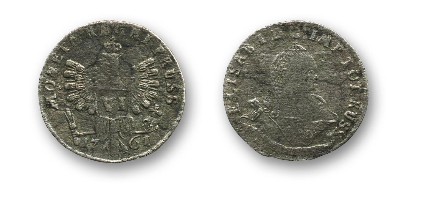 6 грошей. Россия. Прусская губерния. 1761 г. Серебро. «Божьей милостью Мы, Елизавета Первая, Императрица и Самодержица Всероссийская и проч., проч., и проч. Нашему генералу-поручику, действительному камергеру и Королевства Прусского губернатору Корфу. Из реляции вашей № 29 от 29 числа минувшего января с особливым удовольствием видели Мы новый опыт к службе Нашей усердия, представлением чтоб для отвращения опасаемого в королевстве Прусском недостатка в тамошних мелких деньгах, а более для прибыли тем казни Нашей, делать помянутые мелкие деньги на кенигсбергском монетном дворе, на основании взятого вами от тамошнего монетного контролера Цитемана плана...» Болотов Андрей Тимофеевич (1738-1833): «Узнав, что находился в Кенигсберге прежний монетный двор со всеми его орудиями и мастерами, собрали мы всех нужных к тому мастеров, отыскали монетного мастера, и мне поручено было от губернатора сделать для стемпеля рисунки, которые я смастерил как умел. На сих деньгах изображён был с одной стороны грудной портрет императрицы, а с другой - прусский герб: одноглавый орёл с надписью. Губернатор рисунками моими был доволен и по оному были вырезаны стемпели и мы стали делать деньги. При сём том случае удалось мне впервые видеть, как делаются на монетных дворах и тиснятся деньги. Я смотрел на всё производство сей работы с отменным любопытством, не мог всеми выдуманными к тому орудиями и пособиями довольно налюбоваться».