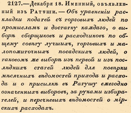 29 декабря (18 декабря ст.ст.) Именный, объявленный из Ратуши. Об уравнении раскладки податей с торговых людей по промыслам и достатку каждаго, о выборе сборщиков и расходчиков по общему совету лучших, торговых и малопожиточных посадских людей, о таковом же выборе из первой и из последней статей людей для поверки месячных ведомостей прихода и расхода и о присылке в Ратушу ежегодно означенных выборов, за руками избирателей, и перечневых ведомостей о мирских расходах.