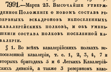 7991. 1835 год. 4 апреля (23 марта ст.ст.) Высочайше утвержденное Положение о новом составе резервных эскадронов непоселенных кавалерийских полков, и об уменьшении состава полков поселенной кавалерии1. Во всех кавалерийских полках непоселенной кавалерии, т.е. 1,2,3,4,7 и вторых бригадах 5 и 6 Легких Кавалерийских дивизий, а также 3 резервном кавалерийском Корпусе, - нынешние резервные эскадроны упраздняются <…>
