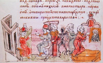 «Владимир мог бы сесть на престоле родителя своего; но сей чувствительный, миролюбивый Князь уступил оный Изяславову сыну и, сказав: "Отец его был старее и княжил в столице прежде моего отца; не хочу кровопролития и войны междоусобной", объявил Святополка Государем Российским; сам отправился в Чернигов, а брат его, Ростислав, в Переяславль. Святополк, княжив несколько лет в Новегороде, еще в 1088 году выехал оттуда, будучи, как вероятно, недоволен его беспокойными гражданами (которые тогда же призвали к себе юного Князя, Мстислава, сына Владимирова) и жил в Турове: он с радостию прибыл в Киев [24 апреля 1093 г.], и народ также с радостию встретил нового Государя, обещая себе мир и тишину под его властию. Сия надежда не исполнилась, и начало Святополкова княжения ознаменовалось великими несчастиями. Половцы, узнав о кончине Всеволода, изъявили желание остаться друзьями России. Легкомысленный Святополк не посоветовался с Боярами отца своего и дяди: велел заключить Послов в темницу; но сведав, что мстительные варвары везде жгут и грабят в его области, вздумал сам просить их о мире. Половцы уже не хотели слушать сих предложений, и Великий Князь, собрав только 800 воинов, спешил выступить в поле. Едва благоразумные Бояре могли удержать его, представляя ему, что вопреки надменному самохвальству молодых людей, нужны не сотни, а тысячи для отражения врагов; что область Киевская, изнуренная войнами, истощенная данями, опустела и что надобно требовать помощи от мужественного Владимира. Князь Черниговский немедленно вооружился и призвал брата своего, Ростислава. Но Князья, соединив дружины, не могли согласиться в мыслях; стояли под Киевом и ссорились между собою. Наконец Бояре сказали им: "Ваша распря губит народ; смирите врагов и тогда уже думайте о своих несогласиях". Святополк и Владимир, приняв благой совет, обнялися братски и в знак искренней взаимной любви целовали святой крест, по тогдашнему обыкновению. Неприятели осаждали Торческ, город, населенный Торками, которые, оставив жизнь кочевую, поддалися Россиянам: Князья хотели освободить его, Святополк битвою, Мономах миром. Остановясь близ Триполя, они призвали Бояр на совет. Янь, Воевода Киевский, друг блаженного Феодосия, и многие другие были одного мнения с Князем Черниговским. "Половцы (говорили они) видят блеск мечей наших и не отвергнут мира". Но Киевляне, желая победы, склонили большинство голосов на свою сторону, и войско Российское перешло за Стугну. Святополк вел правое крыло, Владимир левое: Ростислав находился в средине. Они поставили знамена между земляными укреплениями Трипольскими и ждали неприятеля, который, выслав наперед стрелков, вдруг устремился всеми силами на Святополка. Киевляне не могли выдержать сего удара и замешались. Великий Князь оказал примерную неустрашимость; бился долго, упорно и последний оставил место сражения. Средина и левое крыло, не умев искусным, быстрым движением спасти правого, еще несколько времени стояли, но также уступили превосходству неприятеля. Земля дымилась кровию. Россияне, спасаясь от меча победителей, толпами гибли в реке Стугне, которая от дождей наполнилась водою. Мономах, видя утопающего брата, забыл собственную опасность и бросился во глубину: усердная дружина извлекла его из волн - и сей Князь, оплакивая Ростислава, многих Бояр своих, от