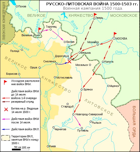«Центром обороны Александра стал Смоленск — ключевая крепость на пути к Вильно. На этом направлении и должны были развернуться основные военные действия. Кульминационным пунктом их стала битва при реке Ведроши, «у Елны» (Тип.). Сохранилось несколько рассказов об этой битве, одной из крупнейших в русской военной истории феодального периода. Кроме официальной версии летописей (о битве «на Миткове поле на речке на Ведроши») интересны сообщение Кирилловского летописца (о битве «на реце на Полме»), рассказ Типографской летописи, записки Герберштейна, свидетельство Устюжского летописца (битва у реки Троены) и запись Пространной редакции разрядных книг («на реке на Полмене в Тишинове»; в Щукинском списке — «Полме на поле в Тишинове»). Есть и литовская версия — Хроники Быховца (битва в районе Ельни, вблизи деревни Ведроши). Тщательное изучение этих источников и географических данных привело С. М. Каштанова к следующим выводам. Узнав о падении Брянска (после 3 мая 1500 г.) и о переходе на русскую сторону князей Семена и Василия, Александр отправил войска гетмана Константина Ивановича Острожского к Смоленску. Сам же Александр «со всеми людьми Великого княжества Литовского» пошел к Минску, затем к Борисову, где «простоял немало времени». Прибыв в Смоленск и получив известие, что Юрий Захарьич стоит на Ведроши «с очень небольшим числом людей», гетман направился вместе с смольнянами к Дорогобужу и подошел к Ельне. Здесь он от «языка» узнал, что войско Юрия Захарьича действительно было небольшое, но «третьего же дни» к нему прибыли на помощь «другие большие воеводы», в их числе князья Д. В. Щеня и И. М. Воротынский (Перемышльский). Все они стояли под Дорогобужем (очевидно, западнее). Не поверив [185] этому, Острожский двинулся вперед и прошел от деревни Лопатино к Ведроши. Лопатино располагалось в 10 км юго-западнее Алексина (Ведроши). Речушка Ведрошь, где находилась одноименная деревня, впадала в реку Селню, приток Росны (Тросны). Наступило время битвы, которая должна была определить исход войны. Сначала сражение складывалось успешно для Острожского. Ему удалось разбить передовой отряд русских, который переправился к основным силам на правый берег Ведроши. Но и за рекой литовские войска продолжали громить остатки передового отряда, не успевшие отойти к войску, находившемуся за Тросной. Затем военные действия временно прекратились, и противники «стояша много дни» по обе стороны Тросны. Наконец, перейдя по мосту через Тросну, гетман вступил в бой с главными силами русских, которые возглавлял кн. Д. В. Щеня. Удар, нанесенный засадным полком, оказался решающим. Битва продолжалась шесть часов. Литовцы не выдержали натиска и поспешно отступили. Уничтожив мост через Тросну, русские начали добивать остатки их отрядов на левом берегу реки. Окончательное уничтожение литовской армии произошло на небольшой речушке Полме (впадающей южнее устья Селни в Росну). Именно здесь 14 июля 1500 г. и были взяты в плен гетман и другие литовские воеводы. Пытаясь хоть как-то оправдать поражение, Хроника Быховца утверждает, что в битве 3,5 тыс. литовцев противостояли 40 тыс. русских. Но доверять этим цифрам нельзя. По Новгородской IV летописи, в плен попало 500 литовцев и 5 тыс. человек было убито; по Вологодско-Пермской, было убито свыше 30 тыс. человек. Факт остается фактом: цвет литовск