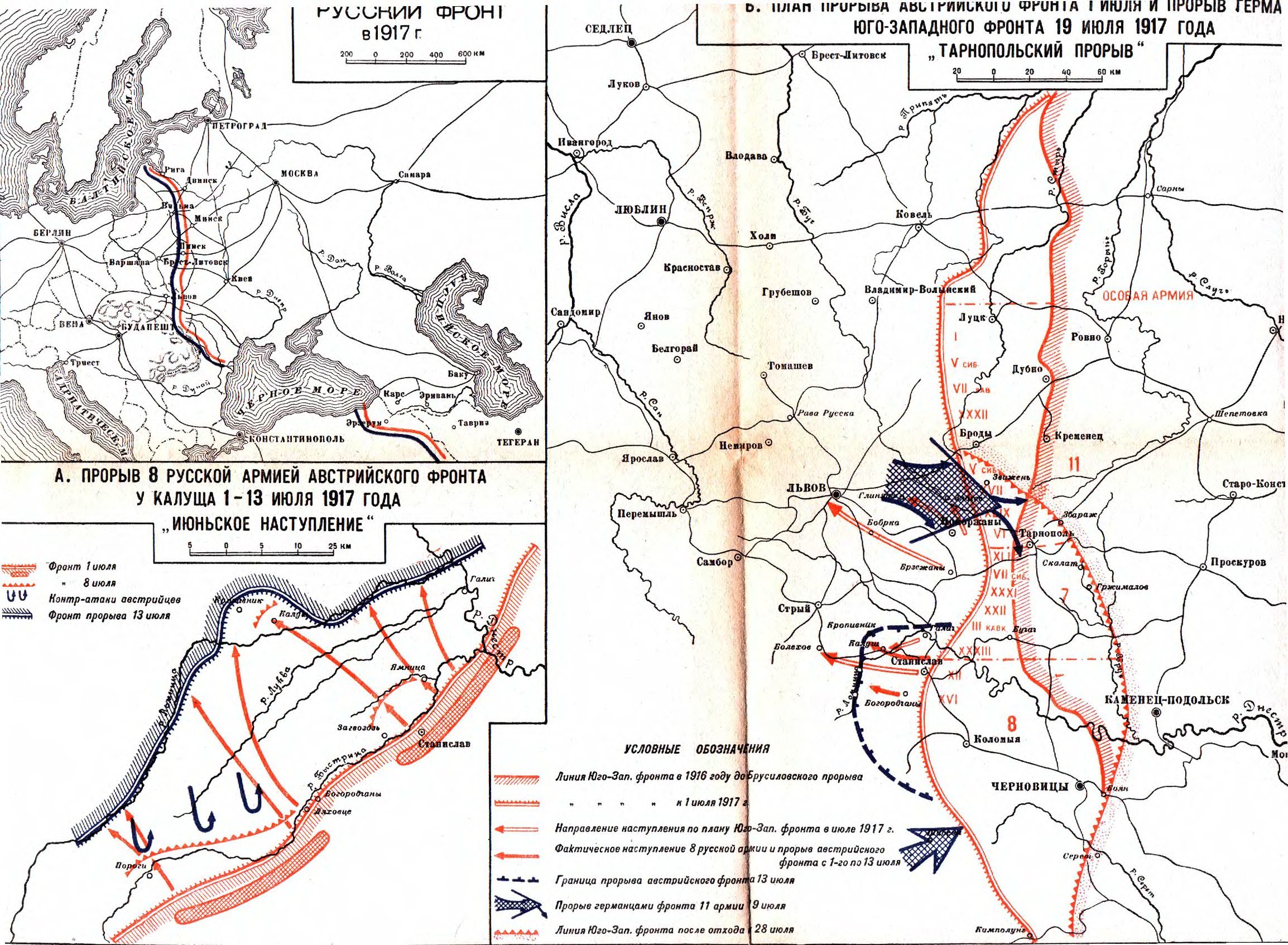 «На Юго-западном фронте ожидаемое наступление состоялось. Общая идея операции сводилась к нанесению главного удара с фронта Поморжаны — Бржезаны на Глиняны — Львов и второстепенного с фронта Галич — Станиславов на Калуш — Болехов. Атака на Северном направлении должна была на несколько дней предшествовать атаке на Южном направлении.