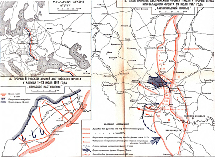 Наступление русских все же должно было произвести сильное впечатление на германское командование. К месту прорыва начали сосредоточиваться резервы сначала с Русского, а потом и с Французского фронтов. Легкости перекидывания этих последних способствовало поведение французского командования и правительства. Крушение грандиозно задуманной Апрельской операции и официальное заявление правительства об отказе на ближайшее время от наступательных операций развязывали руки германскому командованию. И оно широко этим воспользовалось. В первую очередь было брошено 6 дивизий и из них 2 гвардейские».
