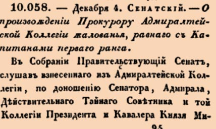 Закон № 10.058. - 1752 год. 4 декабря (15 декабря). Указ об уравнивании жалования прокурора Адмиралтейств-коллегии с окладом капитана 1-го ранга.