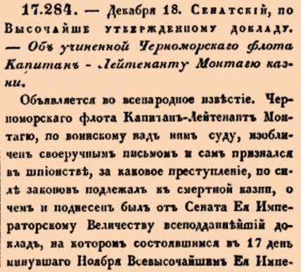 17284. 1794 год. 29 декабря (18 декабря ст.ст.) Сенатский, по Высочайше утвержденному докладу. Об учиненной Черноморскаго флота Капитан-Лейтенанту Монтагю казни.Объявляется во всенародное известие. Черноморскаго флота Капитан-Лейтенант Монтагю, по воинскому над ним суду, изобличен своеручным письмом и сам признался в шпионстве, за каковое преступление, по силе законов подлежал к смертной казни