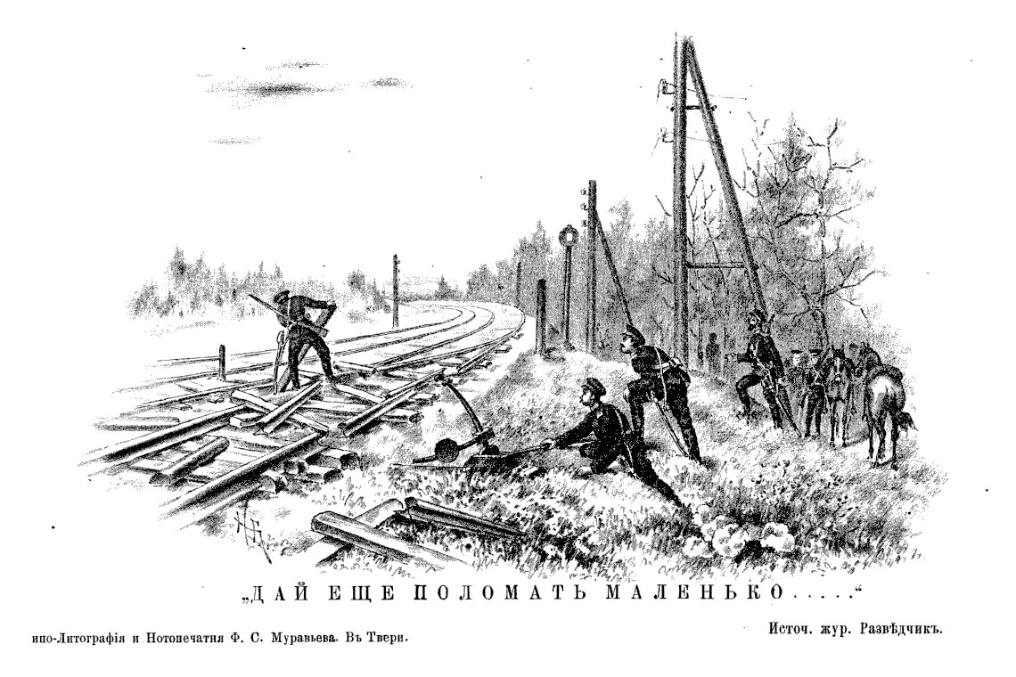 В числе охотников, посланных для порчи железной дороги находился рядовой № 2 эскадрона Борисов. Он был эскадронный кузнец. Были в эскадроне еще и другие кузнецы но на долю Борисова всегда выпадало больше всех работы, так как он был хороший мастер своего дела. Борисов ковал почти всех лошадей. Остальные кузнецы ему помогали только в подготовки гвоздей и подков и в держании ног лошади. Когда случалось копать строгих лошадей. Борисов являлся усмирителем. Он обладал богатырской силой, а, главным образом, помогали ему его серьезность и спокойствие при обращении с лошадью. Наковавшись за день, Борисов не шел в веселые кружки товарищей, a сидел где-нибудь в сторонке, в ожидании ужина. — Что, Борисов, наковался?—спрашивал его иногда взводный офицер, обходивший по вечерам конюшни. — Браковался, ваше благородие. отвечал, улыбаясь, Борисов. Борисов был с виду неуклюжий, но по сложение он был настоящий силач, с широкими плечами, красивым румяным лицом, с большими усами, вьющимися в стороны. В эскадроне его все любили. Его знали в полку все офицеры, Назначенный на ученье, он на другой день раньше всех выводил на площадь своего коня, хорошо вычищенного, правильно поседланного, с примоченною гривкою. Он лихо сидел на коне и внимательно относился к езде. Какую бы ни дали ему лошадь, она ходила у него хорошо. Он был неграмотный и не мог быть произведенным в унтер-офицеры. — Отчего ты неграмотный, Борисов? Разве трудно? Научился бы... — Неграмотный, ваше благородие. Я сам об этом думаю... Да вот все некогда заняться, как следует. Борисову было действительно некогда. Он занят был больше других и едва имел время для отдыха. В свободное время от учений он ходил по конюшням и перековывал лошадей. В руках Борисова и строгая лошадь делалась бессильной, когда он брал ее за ногу. Он обладал богатырскою силою. Вот и здесь при разрушении полотна железной дороги он выказал свою силу. Когда охотники столпились и приступили к работе, турки скоро заметили это и открыли огонь. Пули завизжали около ушей ломавших дорогу солдат. Борисов работал за десятерых, Он с силою отбрасывал тяжелые рельсы, скидывал кучи камней, бросал шпалы, как легкое полено дров. Турецкие выстрелы усилились. Прапорщик Веревкин отозвал солдат, из которых несколько были уже ранены. Борисов продолжал усиленно работать. Он не слышал отзывающего приказания. — Борисов, брось, довольно! кричал офицер из-за прикрытия. Но кузнец-молодец продолжал выворачивать шпалы, не обращая внимания на свистящие возле него пули. Офицер любил его. Он подбежал к нему, схватил его за руку и начал тащить от дороги. — Довольно. Борисов. брось — Постой, ваше благородие! Дай еще поломать маленько... Я, вишь, сейчас.... Только вот.... Его насилу с руганью оттащили и только этим спасли от града сыпавшихся пуль. Выло еще много случаев, в которых рядовой Борисов выказывал свою стойкость и отчаянную храбрость, не щадя живота своего! Конечно, такие солдаты отличаются начальством, и Борисов был отличен и получил в награду георгиевский крест и унтер-офицерское звание. Когда его поздравляли офицеры с получением креста, он отвечал: — Да это что... я с тем и шел на войну, либо этот крест. либо деревянный в поле. Нет, вот что удивительно! и в учебной команде не был, а галуны заслужил. Никогда и во сне этого не видал. — Доковался? говорили офицеры. — Доковал